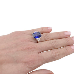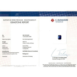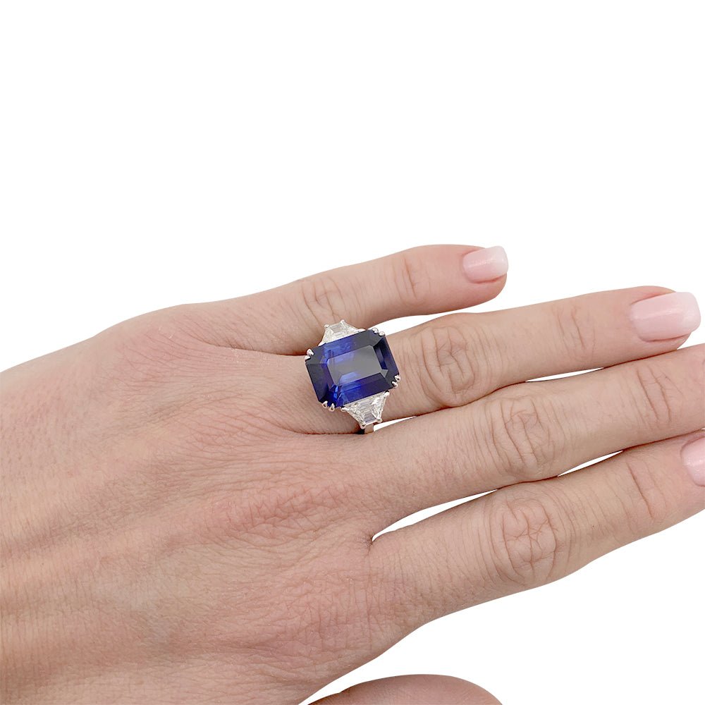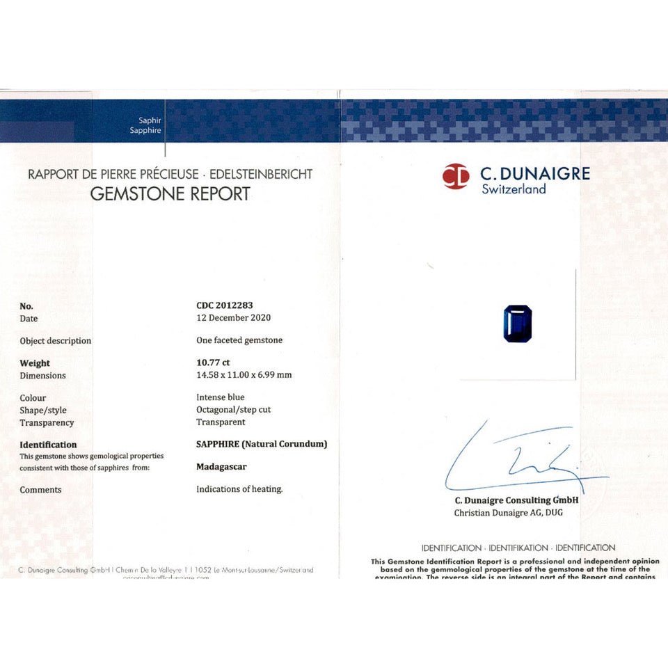 Une bague en or blanc 750/000 sertie d’un saphir rectangulaire de 10,77 cts épaulé de deux diamants trapèzes d’un poids total de 1,20 cts. Certificat du Laboratoire suisse C.Dunaigre : Madagascar, chauffé. Poids : 7,6 grammes Tour de doigt : 53