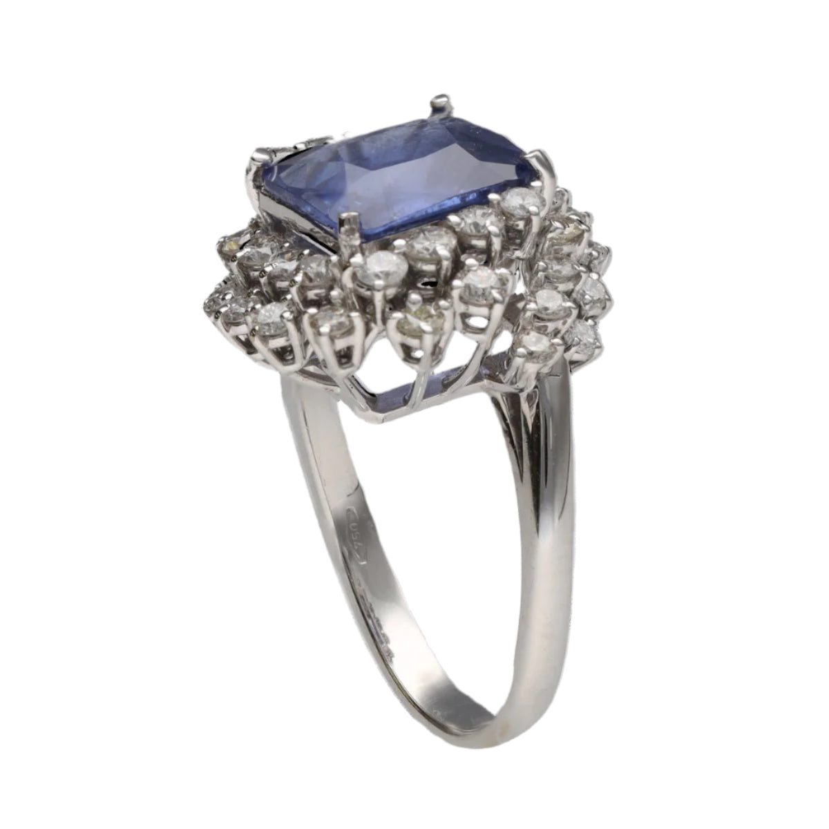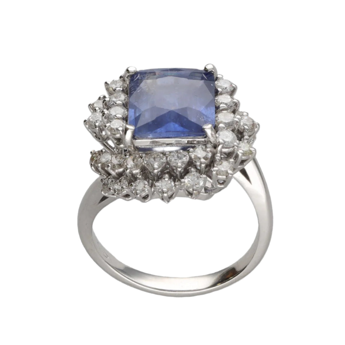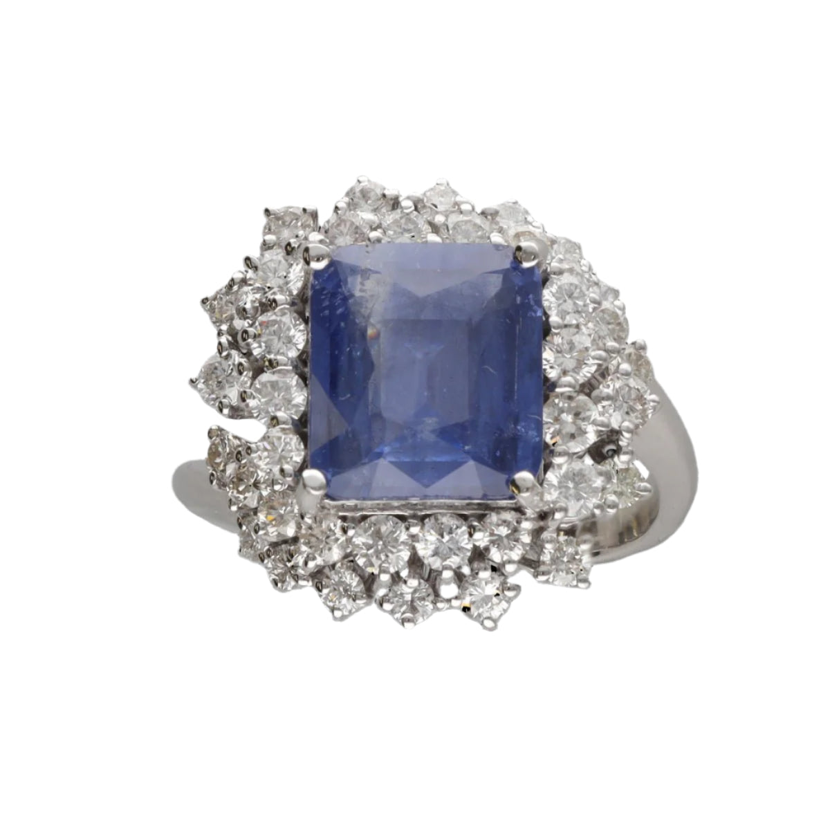 Bague en or blanc 18 carats sertie d’un saphir de Ceylan, entouré de diamants taille brillant.