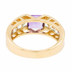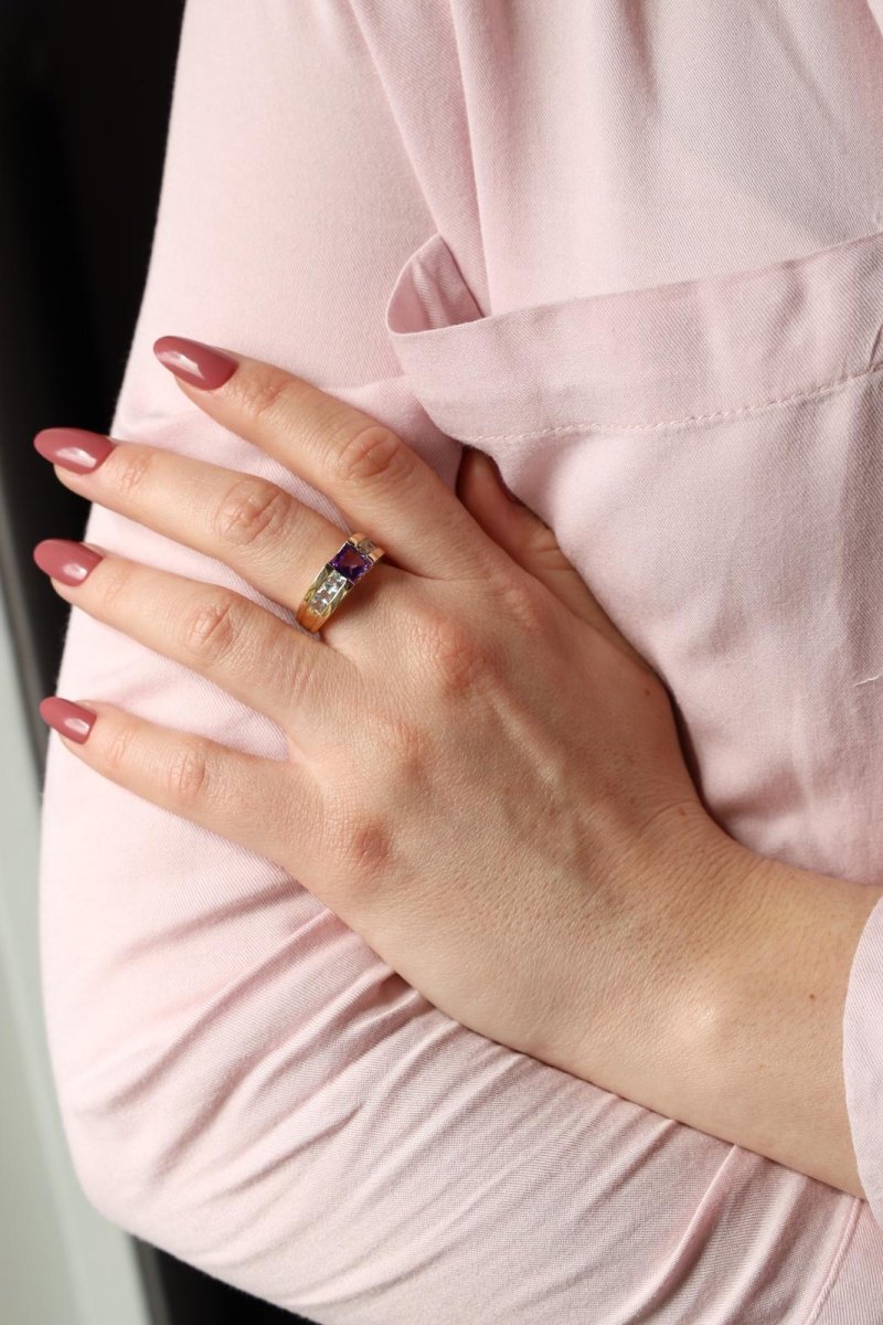 Bague en or jaune 750 millièmes (18 carats). sertie d’une améthyste taille carrée. d’environ 0.66 ct. et de 6 topazes bleues taille princesse. poids total des topazes bleues: environ 0.48 ct. largeur sur le dessus: 0.64 cm. tour de doigt: 52. poids total: 5.64 g. poinçon tête d'aigle. excellent état