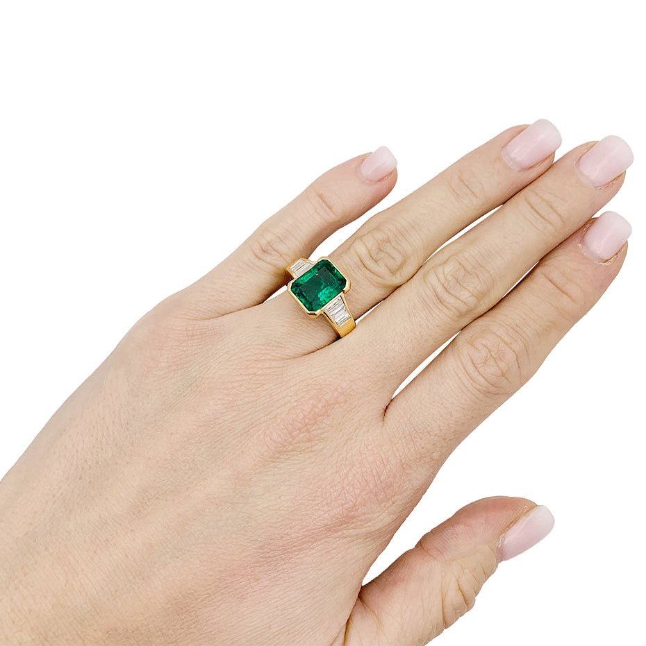 Une bague en or jaune 750/000 sertie d'une émeraude d'environ 3,04 carats taille émeraude épaulée de diamants taille baguette en chute. Certificat Bellerophon N° A11201 indiquant Colombie, “Minor amount of oil” Largeur : 12 mm Hauteur : 7 mm Poid : 9,2 grammes Tour de doigt : 56