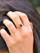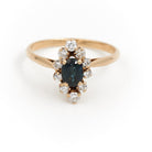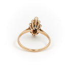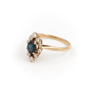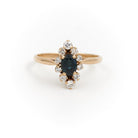 Bague marquise en or jaune 750 millièmes (18 carats). saphir bleu taille ovale d'environ 0.64 ct. 10 diamants taille brillant : 2 d'environ 0.05 ct chacun. 4 diamants d'environ 0.02 ct chacun. 4 diamants d'environ 0.035 ct chacun. poids total diamants : environ 0.32 ct. largeur sur le dessus : 1.27 cm. poids total bijou : 2.29 g. tour de doigt : 52. poinçon tête d'aigle. excellent état