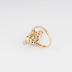 Bague ou marquise diamants ornée de 5 diamants taille ancienne, ornée de chaque côté de petits diamants taille anciennes. Matière : Or et Platine Poinçon : Tête d'aigle Poids : 4,4 grs Longueur : 2,1 cm Largeur : 1,2cm Tour de doigt Modifiable : 49 Nombre de carats : 0,80 ct Nombre de pierres : 24 pierres Période : 1900