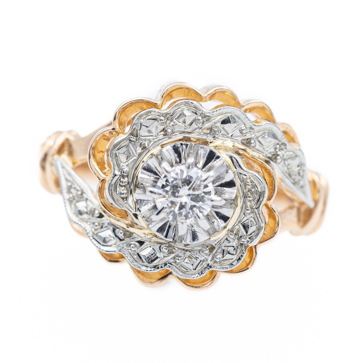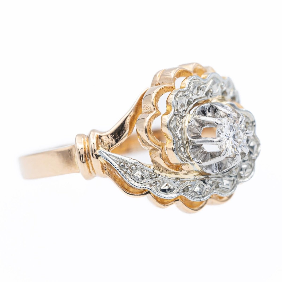 Bague Rétro tourbillon en or blanc et rose 750 millièmes (18 carats). sertie d’un diamant taille brillant. d'un poids total d’environ 0.14 ct. largeur sur le dessus: 1.25 cm. tour de doigt: 52. poids total: 4.18 g. poinçon tête d'aigle. excellent état