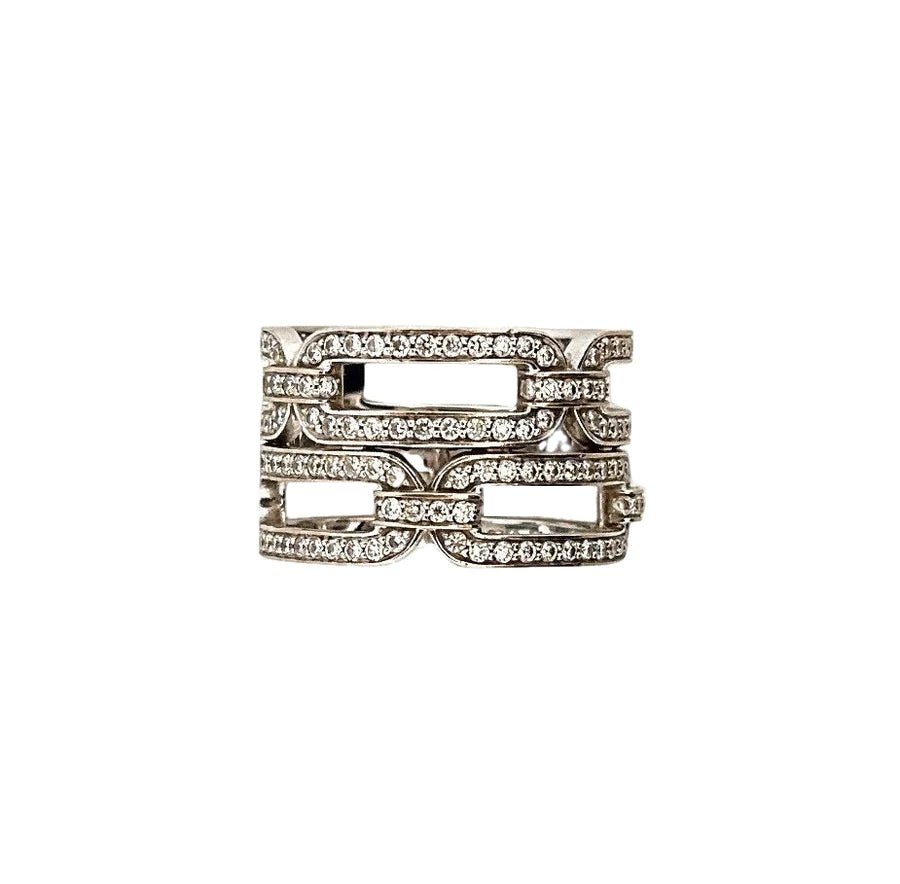 Bague Pavée DINH VAN "Maillon" en or blanc 18 carats, série de diamants. Prix (2018) : 7150€ Did you know ? Le design de cette bague est basé sur un modèle d'archives inspiré par les barrières en maillons de chaîne autour de la place de l'Opéra à Paris.