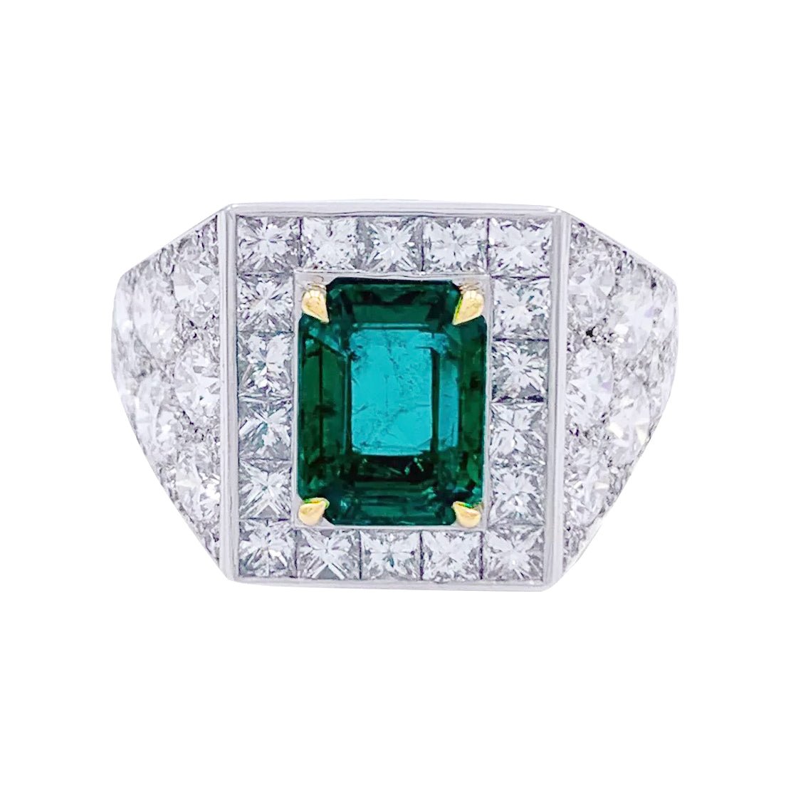 Une bague en platine 950/000 centrée d’une émeraude pesant environ 1,50 carat sertie par quatres griffes en or jaune 750/000, encadrée de diamants taille princesse et épaulée de diamants taille brillant. Largeur : 13 mm Hauteur : 6 mm Poids : 8,8 grammes Poids du diamant : Environ 3 carats Tour de doigt : 53