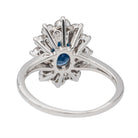 Bague pompadour sertie d'un saphir et de diamants. en or blanc 750 millièmes (18 carats). 1 saphir taille ovale. d'un poids d'environ 1.79 cts. entouré de 12 diamants taille brillant. d'un poids total d'environ 1.54 cts. largeur sur le dessus: 1.75 cm. tour de doigt: 59. poids total: 5.33 g. poinçon tête d'aigle. excellent état