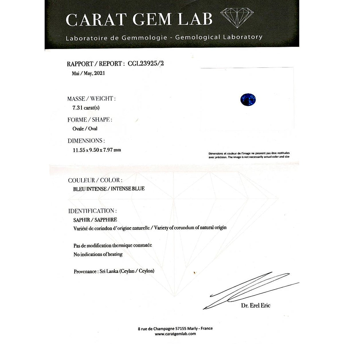 Une bague pompadour en or blanc 750/000 serti d’un saphir ovale de 7,30 carats entouré de diamants taille brillant. Certificat Gem Paris : Sri Lanka - Non chauffé. Longueur : 17 mm Largeur : 16 mm Poids : 6,7 grammes Poids du diamant : 1,06 ct au total Tour de doigt : 53