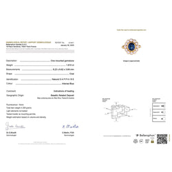 Bague Pompadour en or jaune 18 carats, retenant un saphir chauffé ovale facetté dans un entourage de 12 diamants taille brillant.