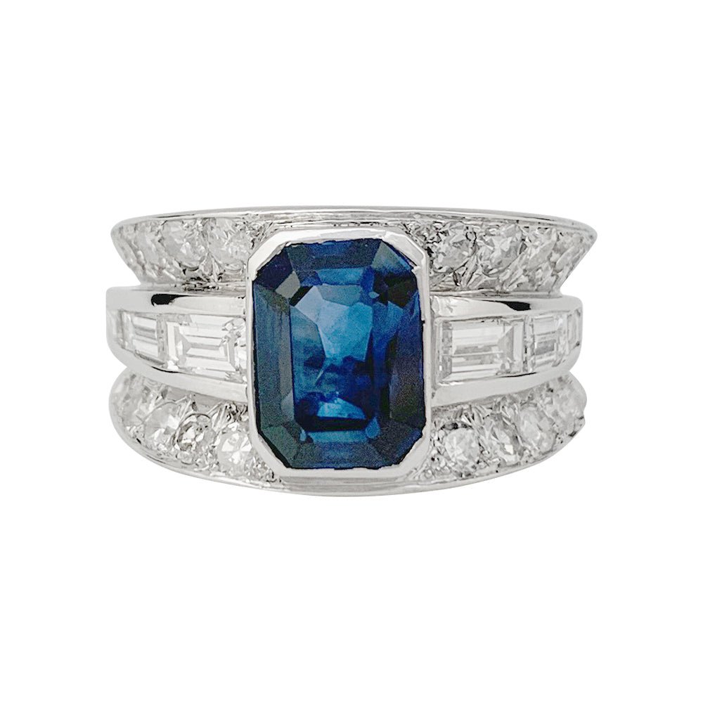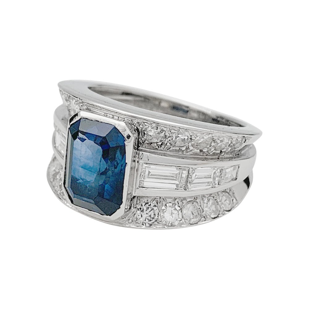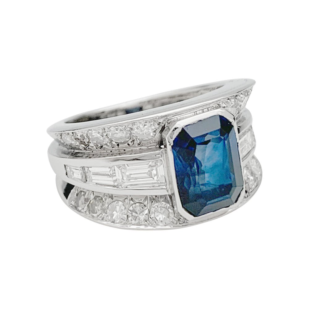 Une bague large en platine 950/000 centrée d’un saphir rectangulaire à pans coupés pesant environ 2 carats épaulé de diamants taille baguette, accompagné de diamant taille 8/8. Certificat Gem Paris. Largeur : 11 mm Poids : 10,2 grammes Tour de doigt : 51.5