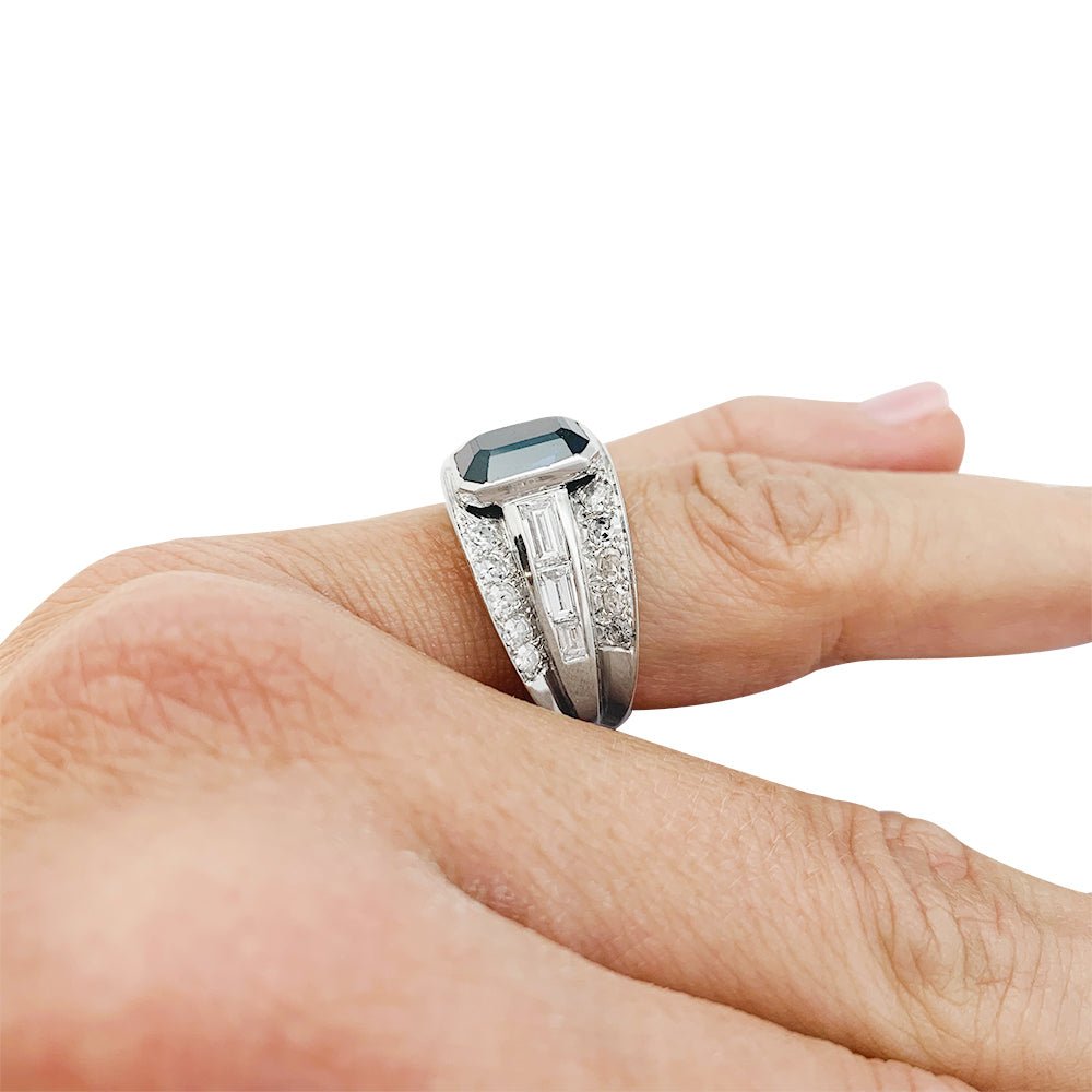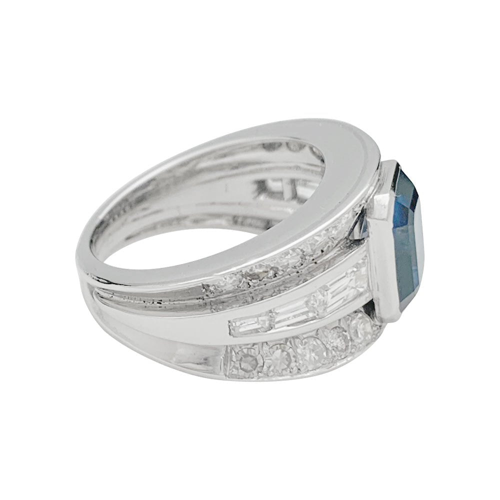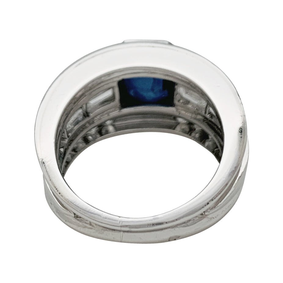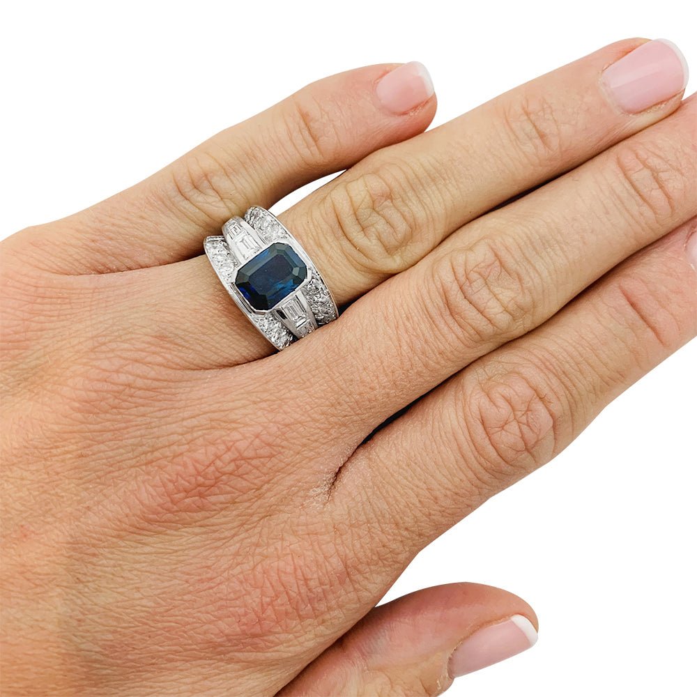 Une bague large en platine 950/000 centrée d’un saphir rectangulaire à pans coupés pesant environ 2 carats épaulé de diamants taille baguette, accompagné de diamant taille 8/8. Certificat Gem Paris. Largeur : 11 mm Poids : 10,2 grammes Tour de doigt : 51.5