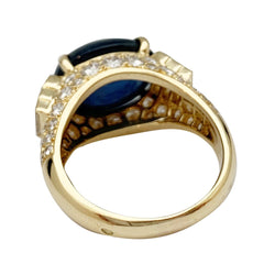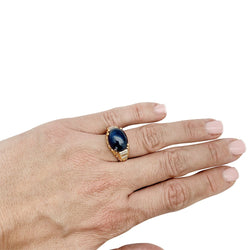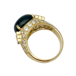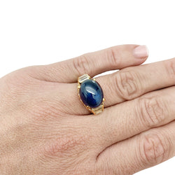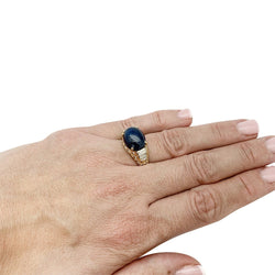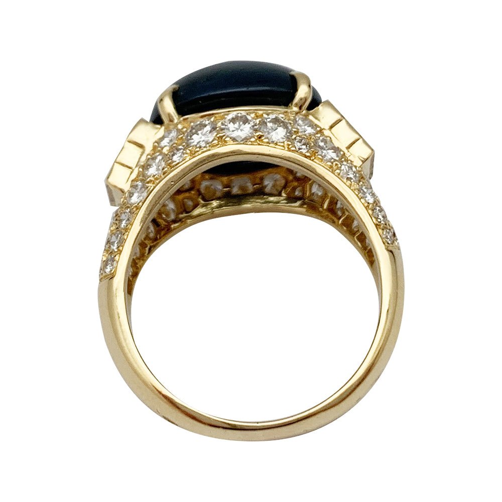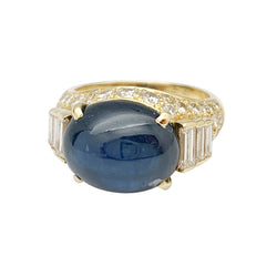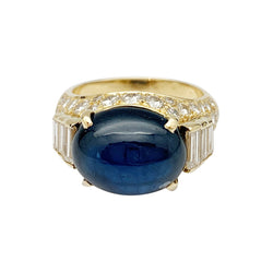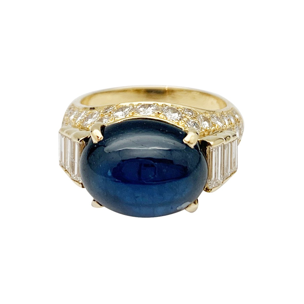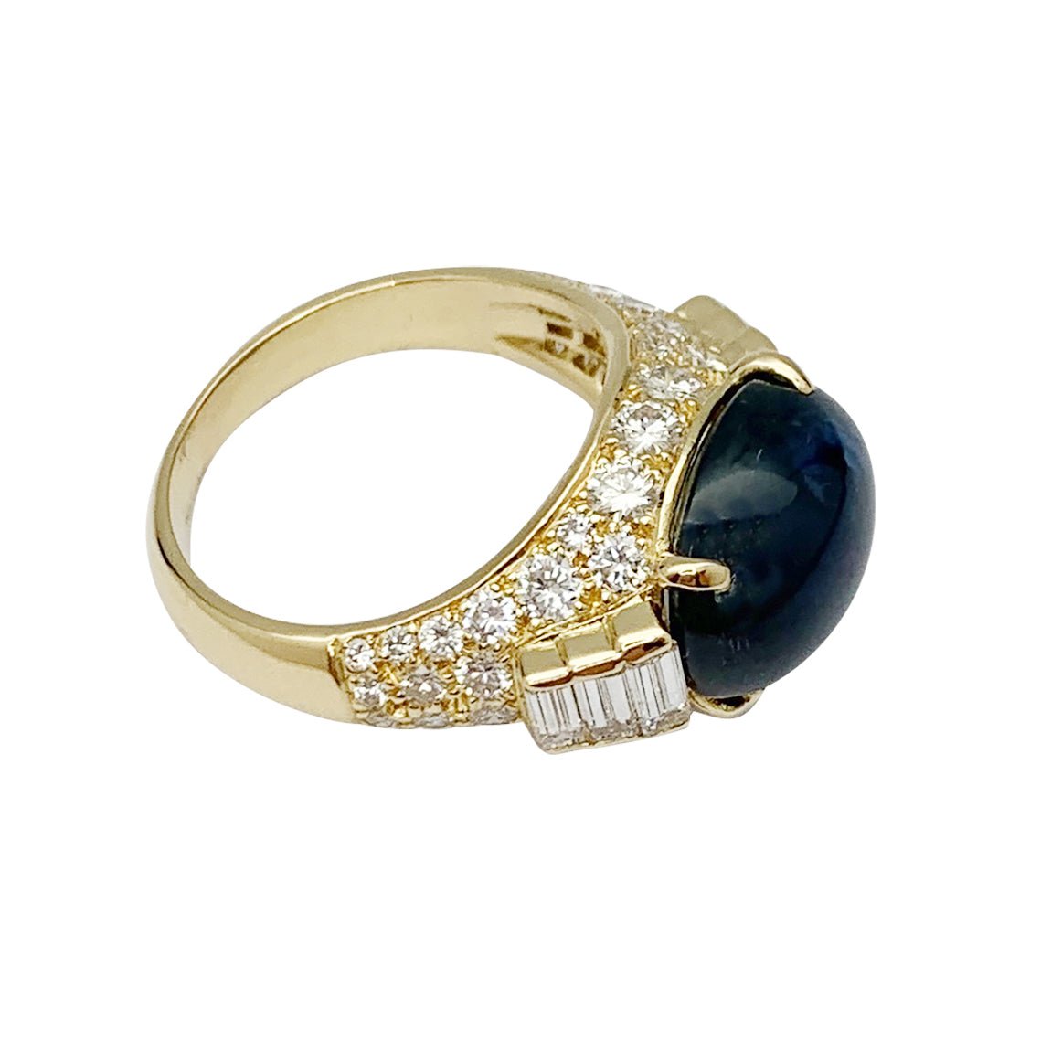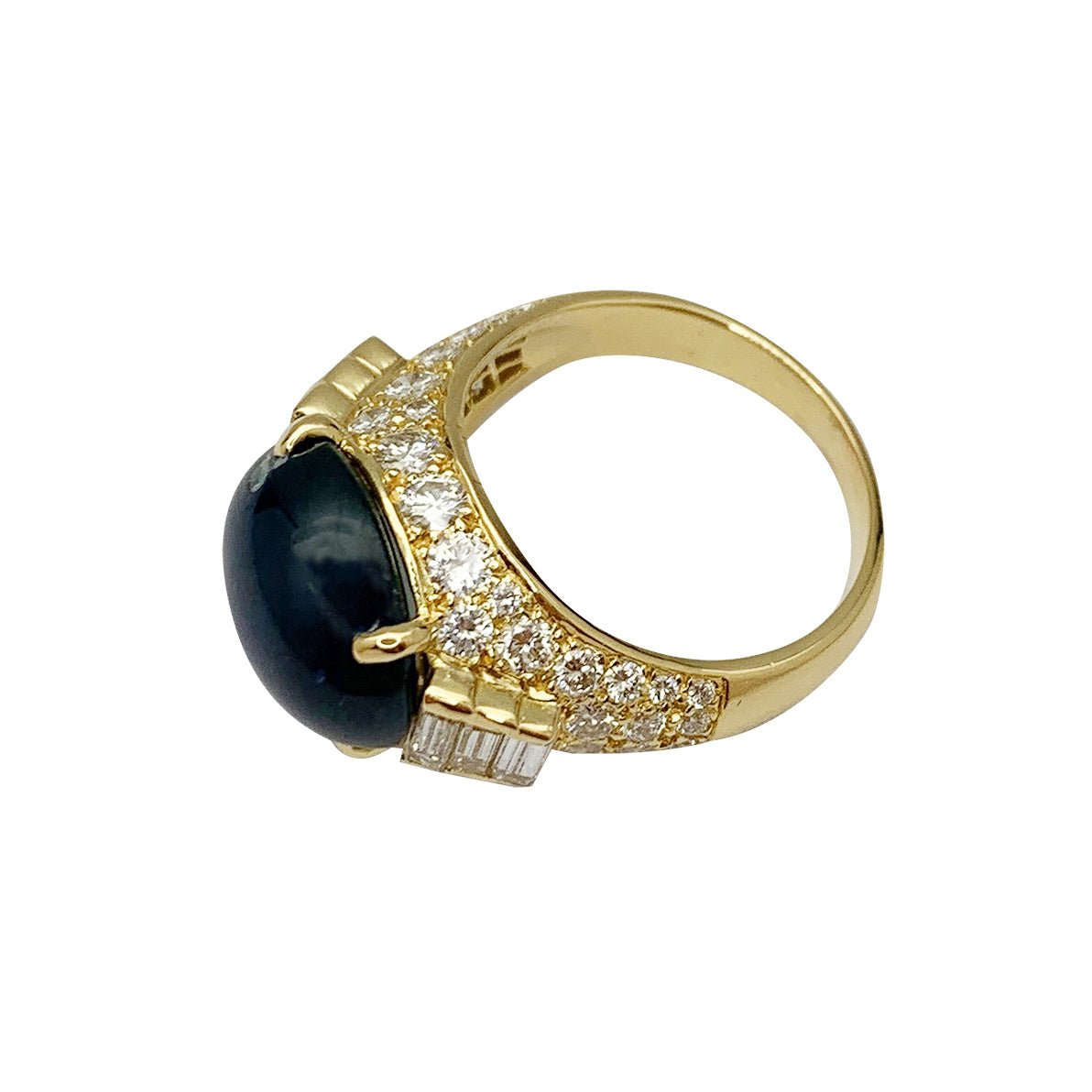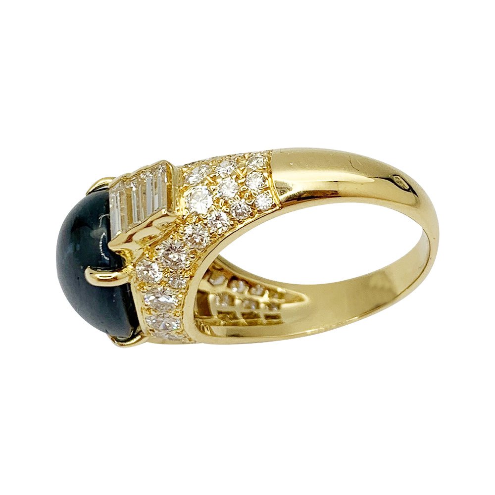 Une bague en or jaune sertie au centre d'un saphir cabochon d’origine Thailande pesant environ 6 carats, la monture est décorée de six diamants de taille baguette et d'un pavage de brillants. Certificat du Laboratoire Gem Paris. Hauteur : 9 mm Poids : 8,6 grammes Poids du diamant : Environ 2,50 carats Tour de doigt : 54