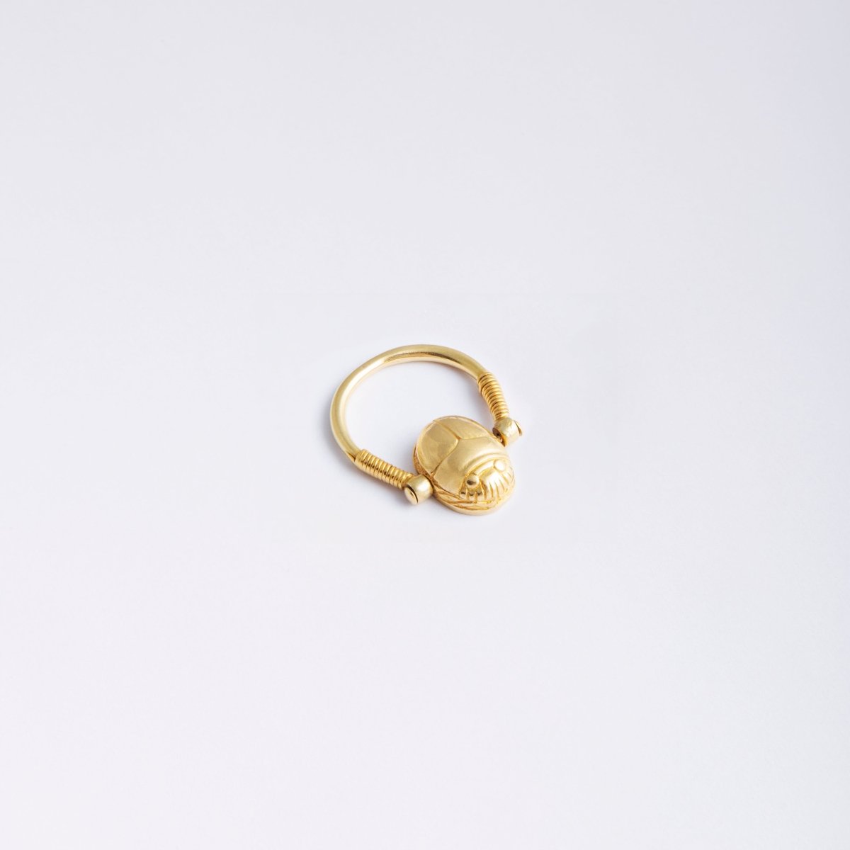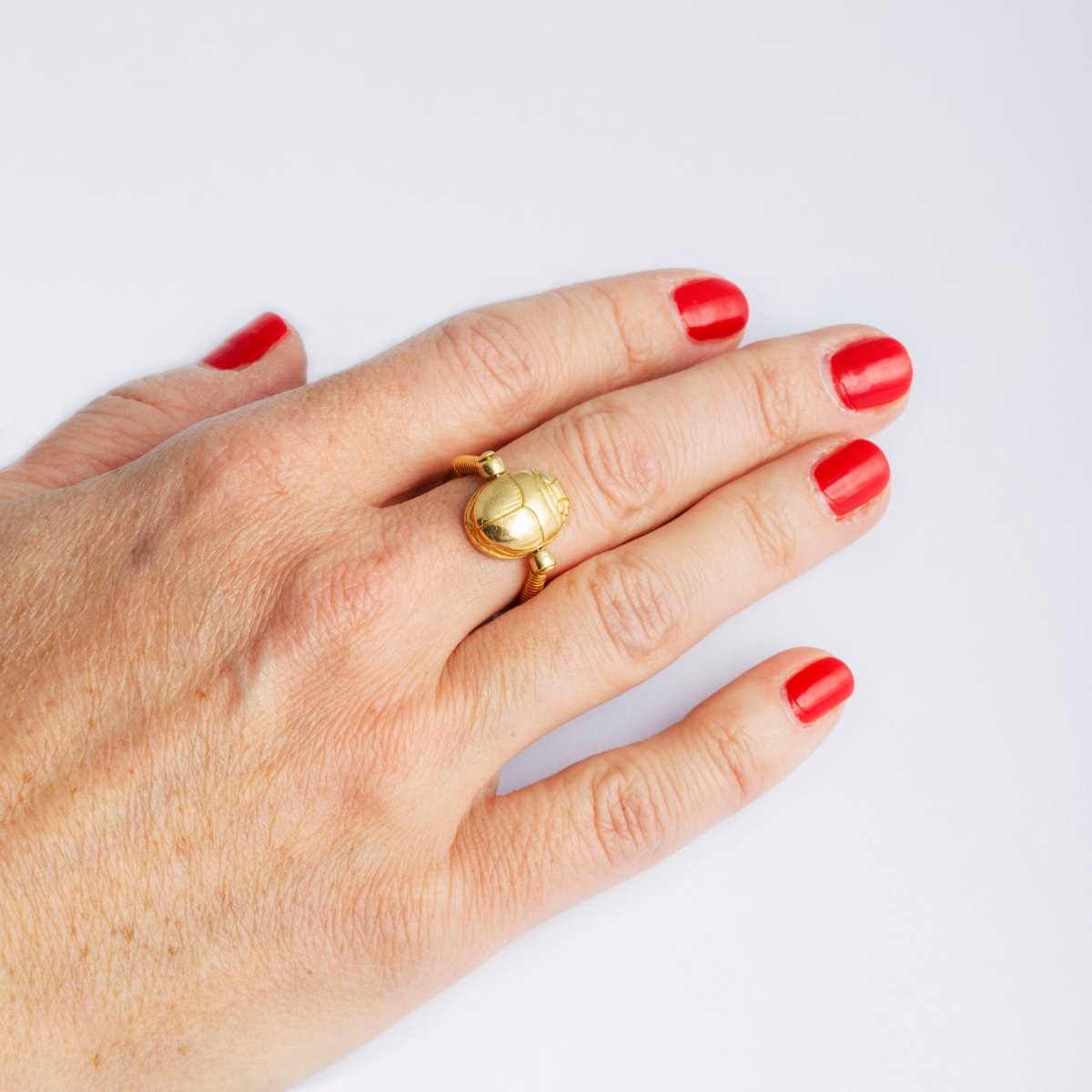 Ravissante bague en or jaune avec un motif central de Scarabée - Egyptomania, début du 19ème siècle. Poids 7,8 g Tour de doigt : 54 Référence : SR3 Tous nos bijoux sont authentifiés par nos experts.