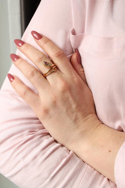 Bague serpent sertie d'un rubis et de diamants. en or jaune 750 millièmes (18 carats). 1 rubis taille poire. d'un poids total d'environ 0.1 ct. et 6 diamants taille huit/huit. d'un poids total d'environ 0.06 ct. (chaque diamant d'un poids d'environ 0.01 ct). largeur sur le dessus: 1.8 cm. tour de doigt: 53. poids total: 6.23 g. poinçon hibou. excellent état