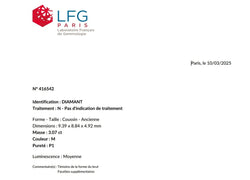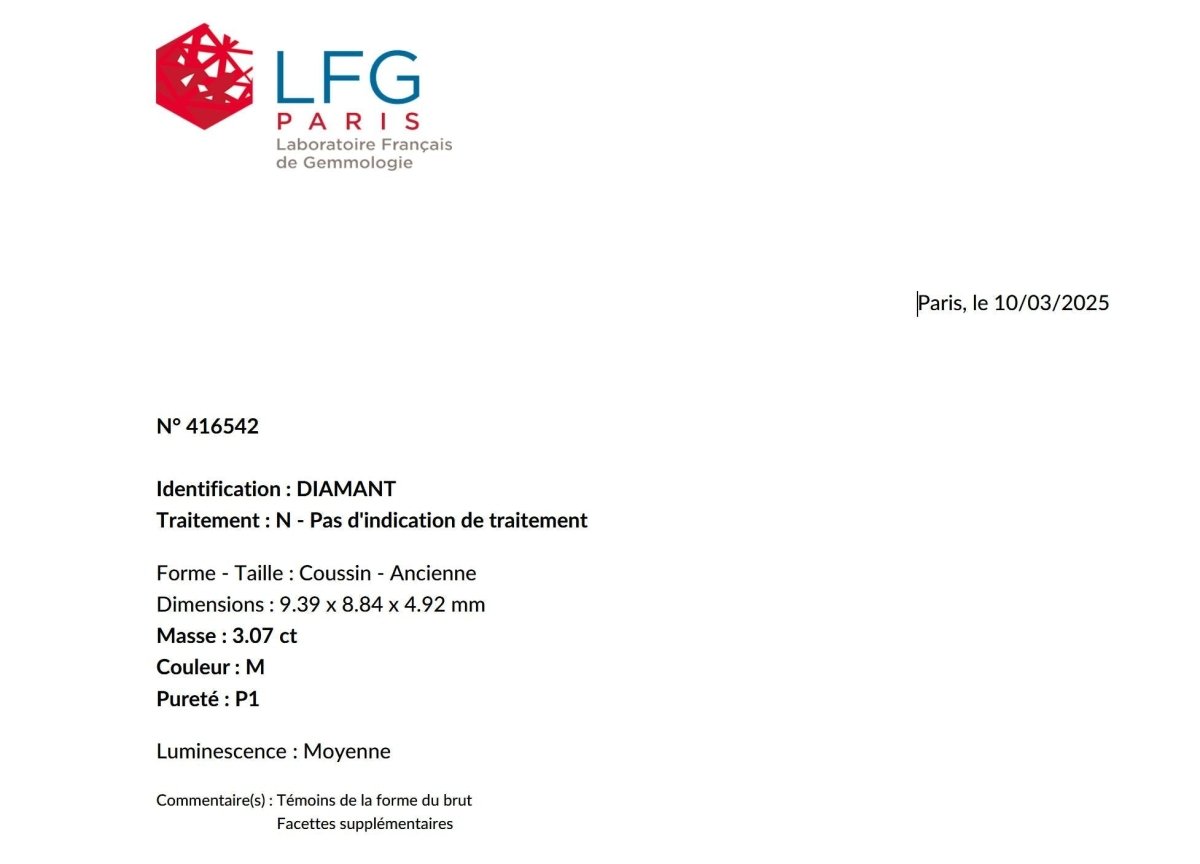 Solitaire vintage diamant Old Mine Cut 3,07 carats Bague solitaire en or rose 18k (750°/°°) et platine sertie en son centre d'un diamant taille coussin taille ancienne Old Mine Cut pesant pesant 3,07 carats (9.39 x 8.84 x 4.92mm) de qualité M P1. Travail probablement français des années 1880. A noter la présence d'un certificat LFG pour la pierre de centre. Tour de doigt 52, mise à taille possible Diamètre du chaton : 1,2 cm Poids brut : 3,47 grammes