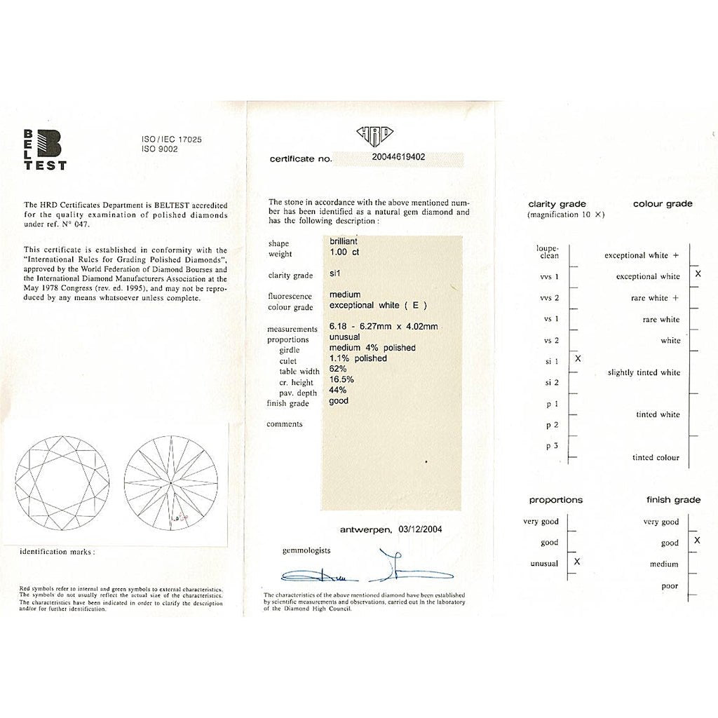 Une bague solitaire en or rose 750/00 sertie d’un diamant taille brillant pesant 1 carat. Qualité du diamant : E/SI1. Certificat du HRD. Poids : 3 grammes Poids du diamant : 1 carat Tour de doigt : 51