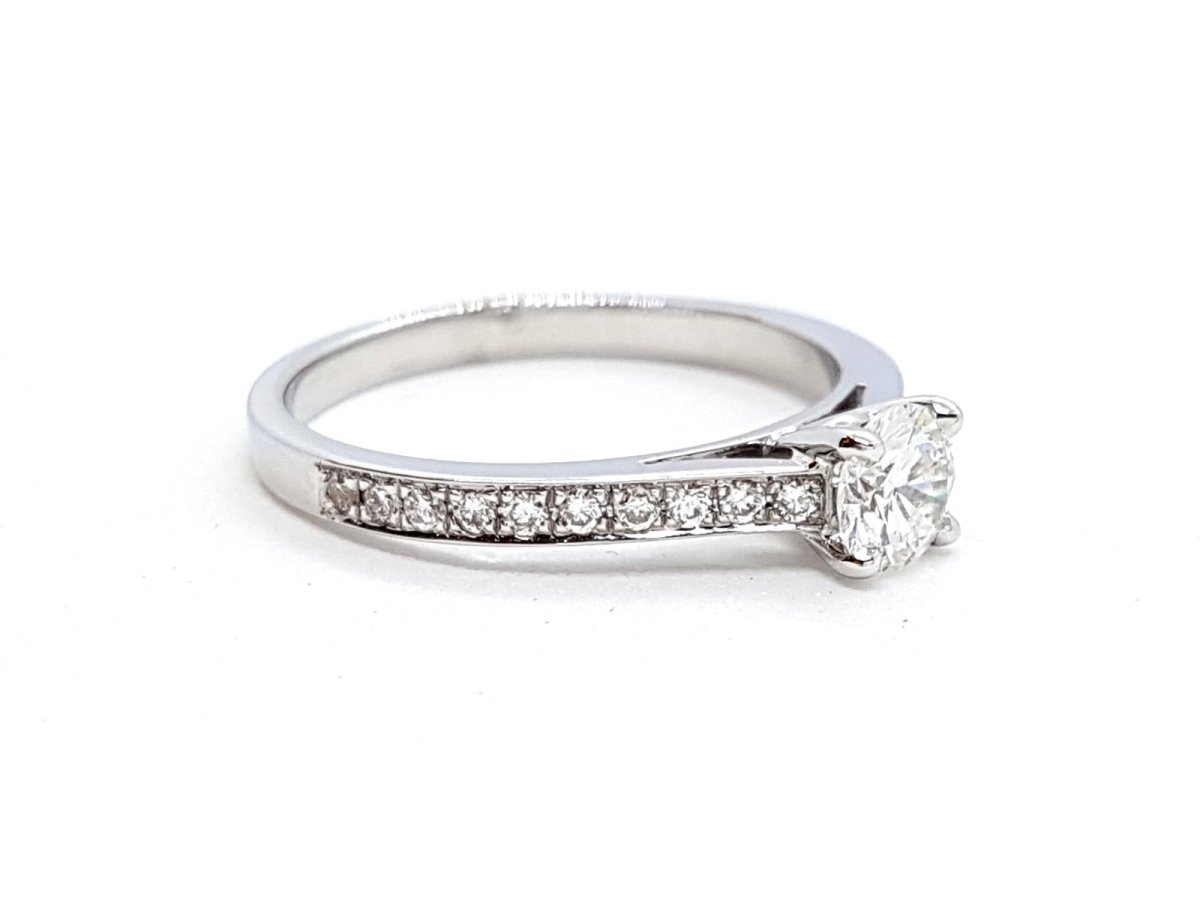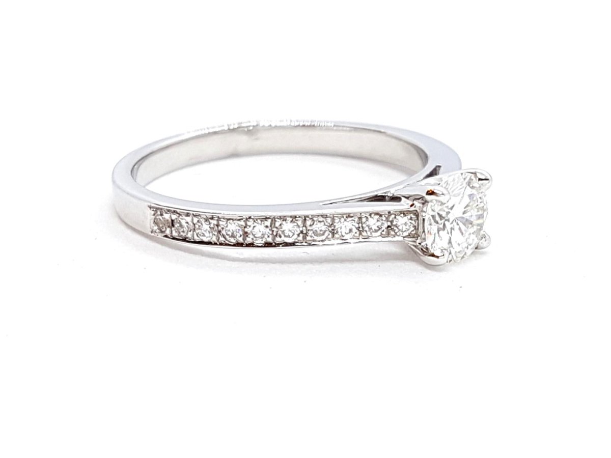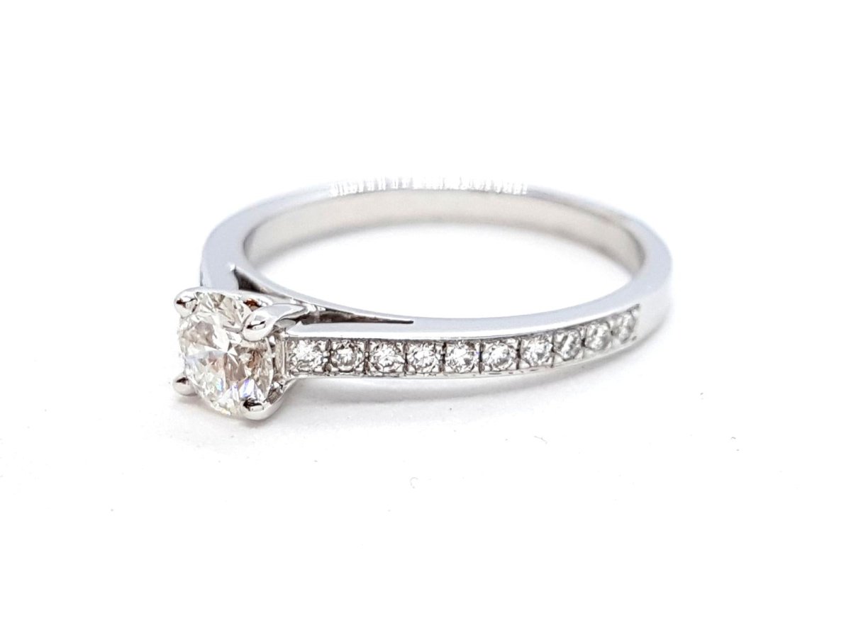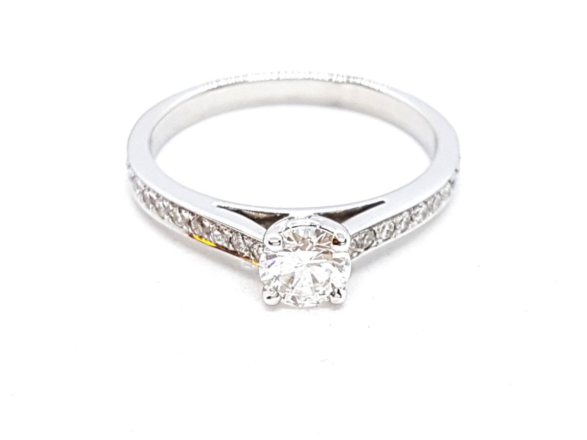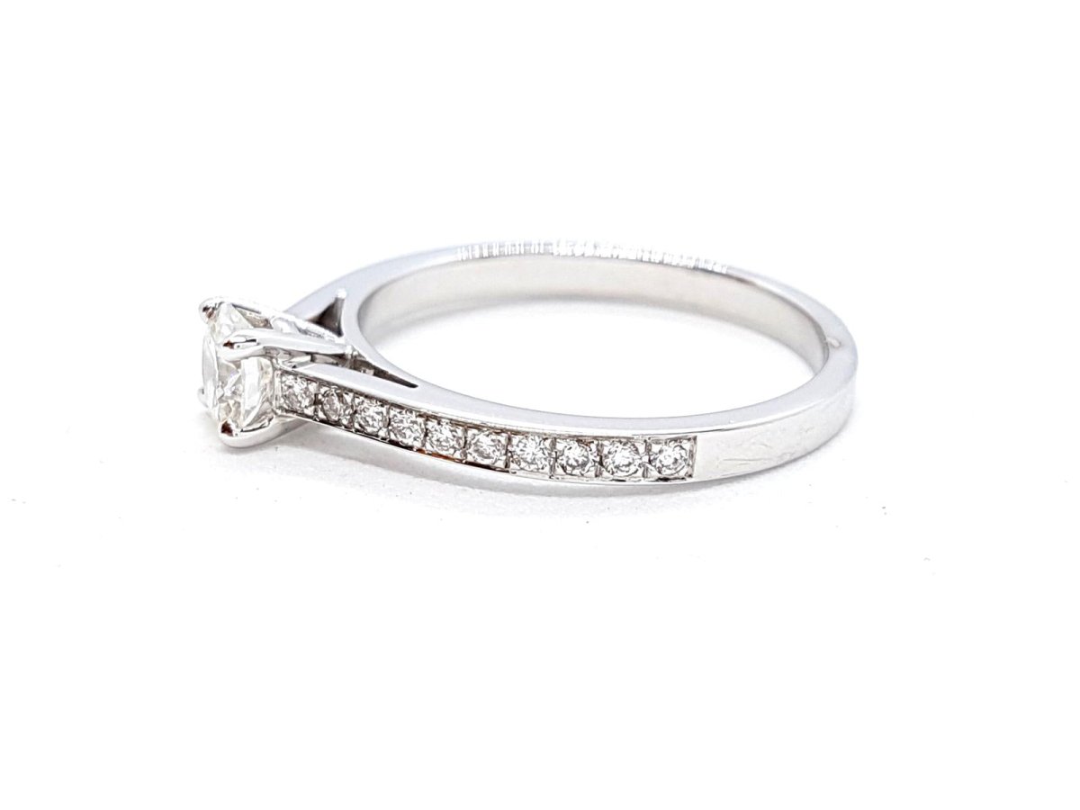 Solitaire en or blanc 750 millièmes (18 carats). serti de diamants taille brillant G- VS2 pour 0.61 carat au total. dont diamant central certifié GIA de 0.42 ct taille brillant G-VS2 et épaulé de 20 diamants taille brillant pour 0.19 ct au total. tour de doigt: 53. largeur sur le dessus: 0.48 cm. largeur de l'anneau: 0.20 cm. poids total: 2.67 g. poinçon tête d'aigle. état neuf