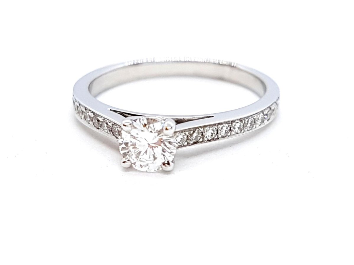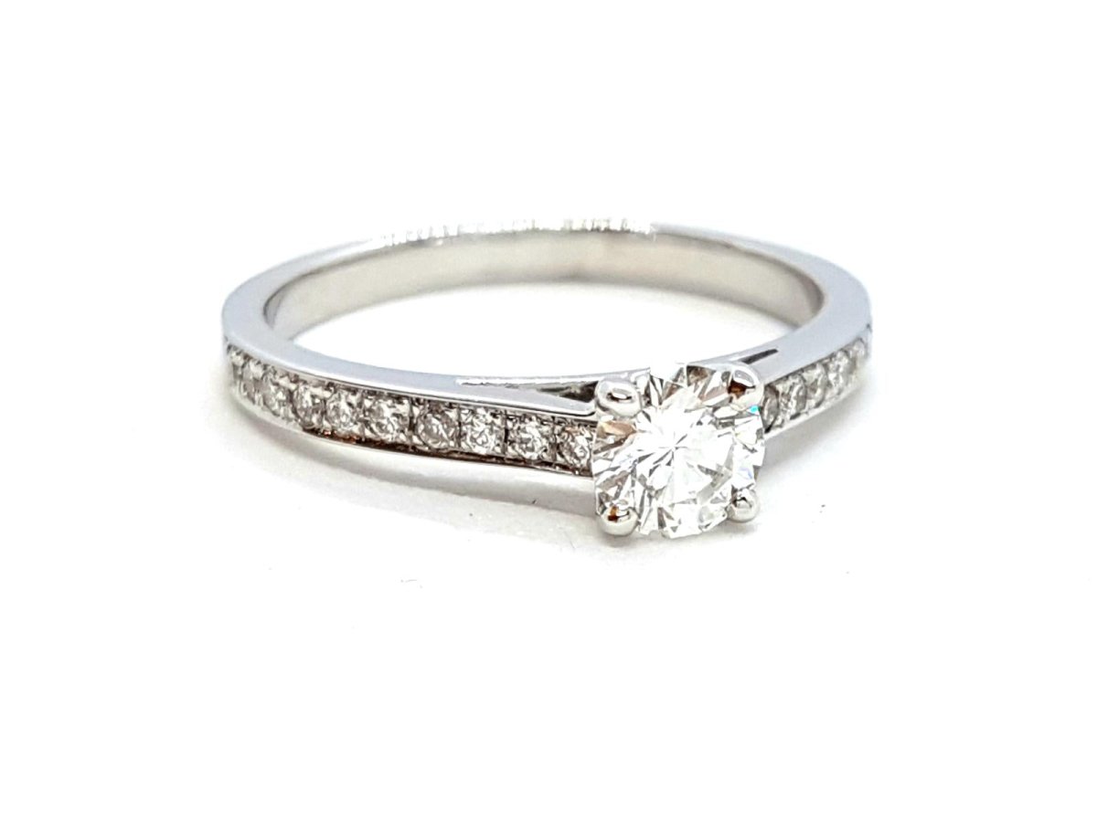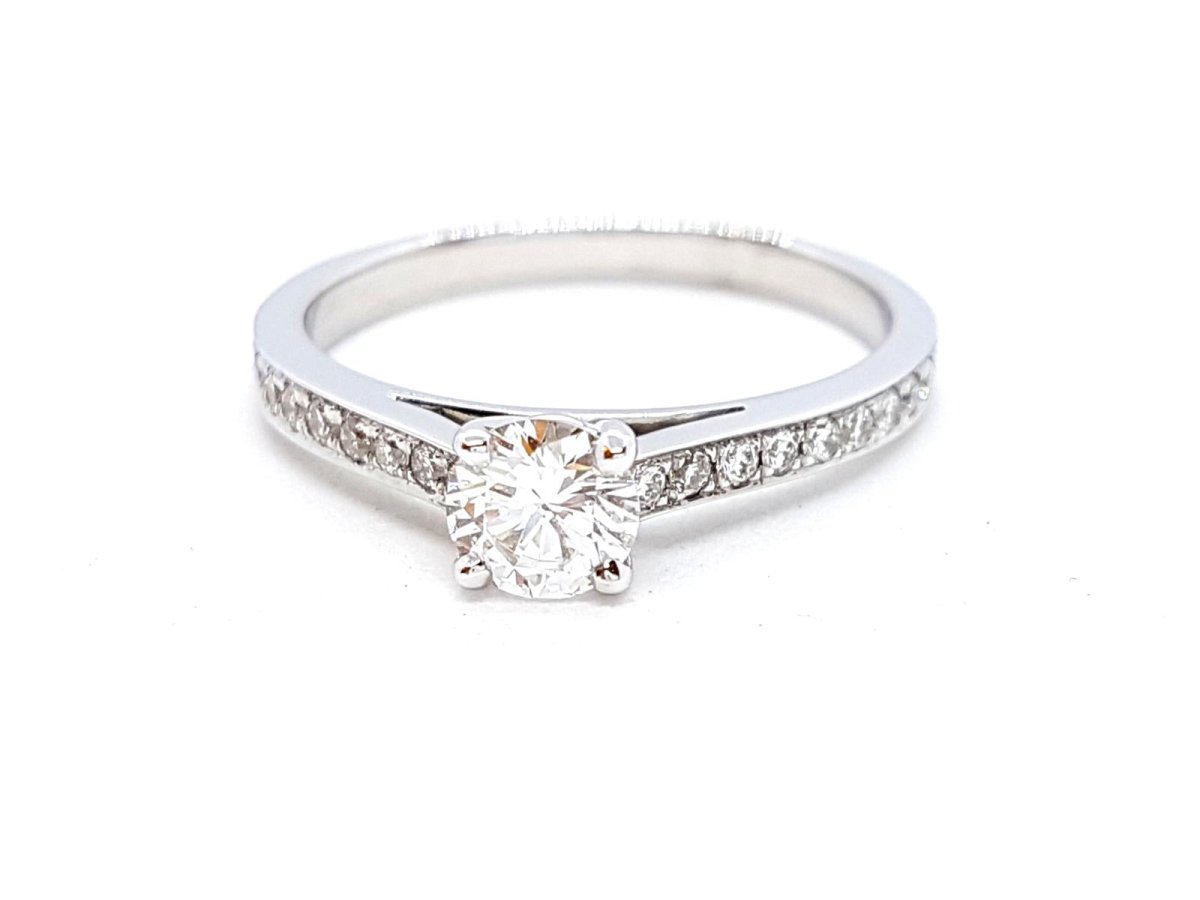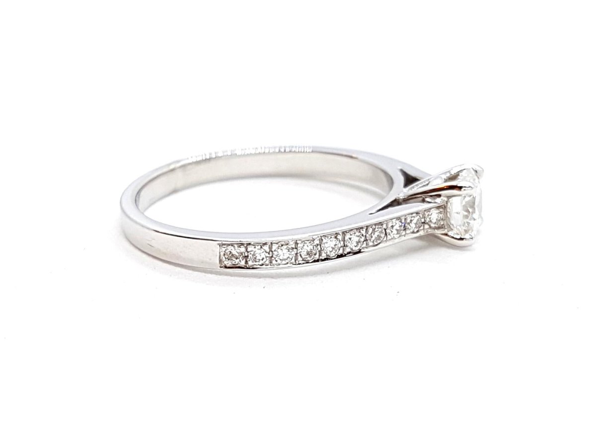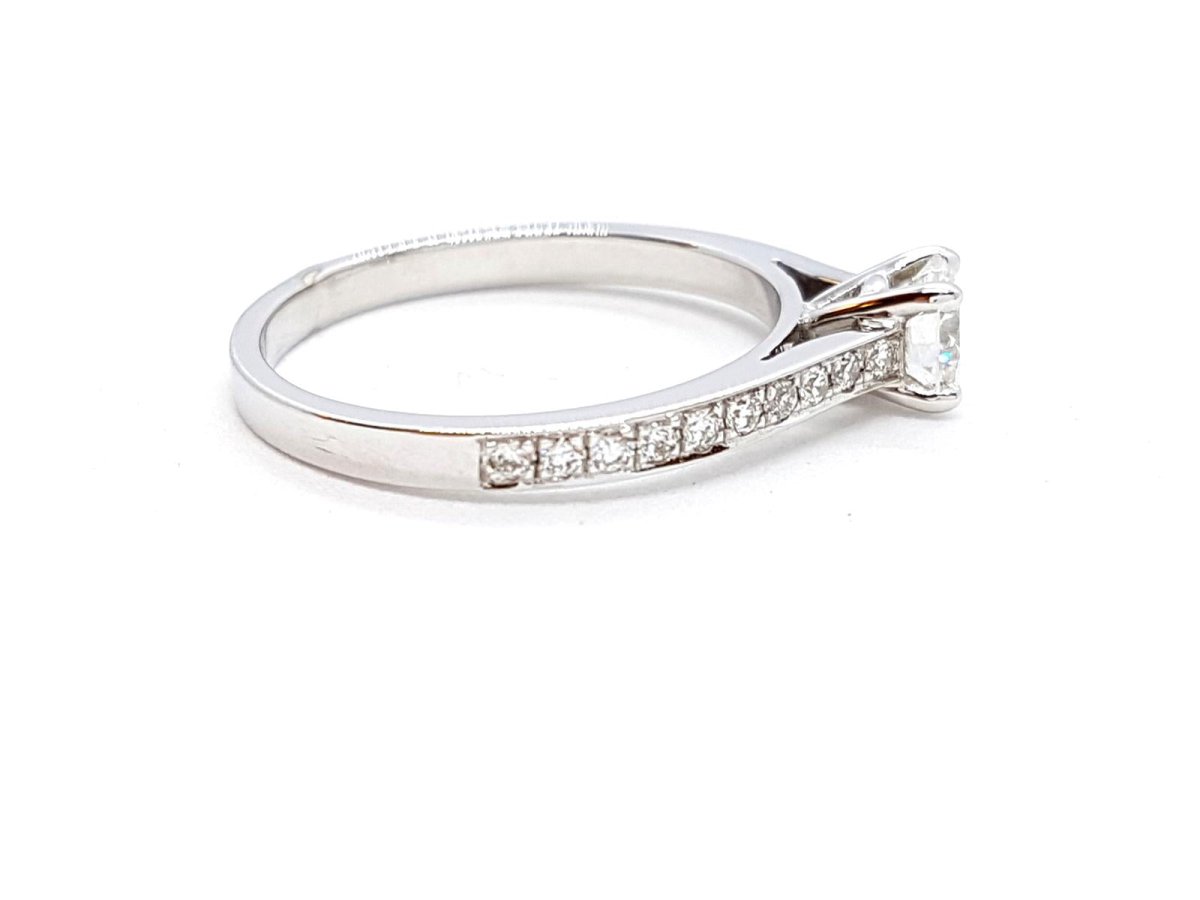 Solitaire en or blanc 750 millièmes (18 carats). serti de diamants taille brillant G- VS2 pour 0.61 carat au total. dont diamant central certifié GIA de 0.42 ct taille brillant G-VS2 et épaulé de 20 diamants taille brillant pour 0.19 ct au total. tour de doigt: 53. largeur sur le dessus: 0.48 cm. largeur de l'anneau: 0.20 cm. poids total: 2.67 g. poinçon tête d'aigle. état neuf