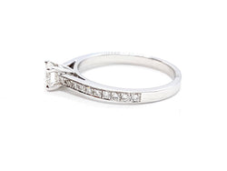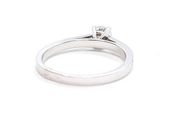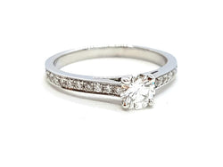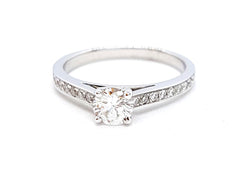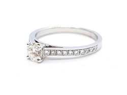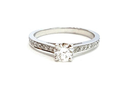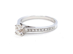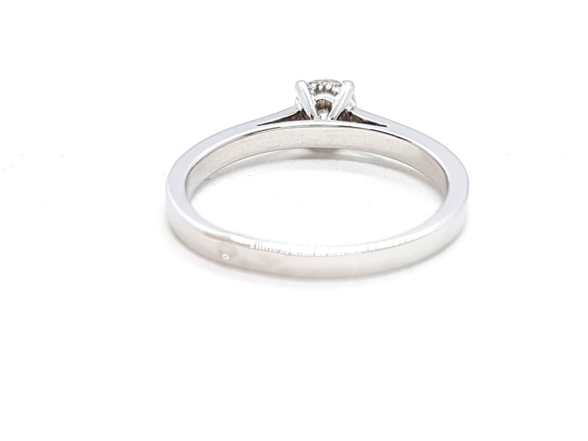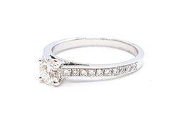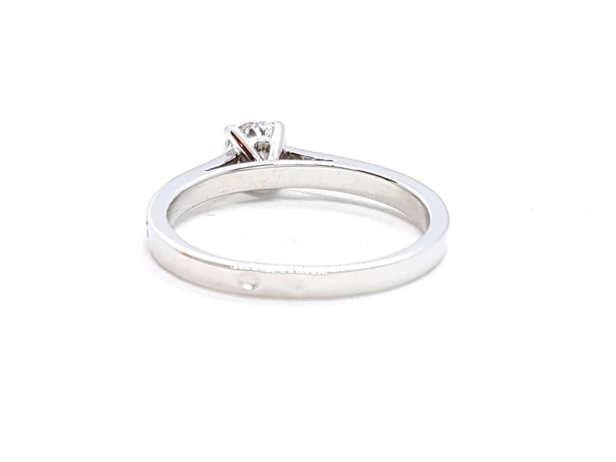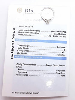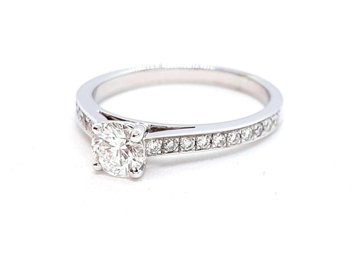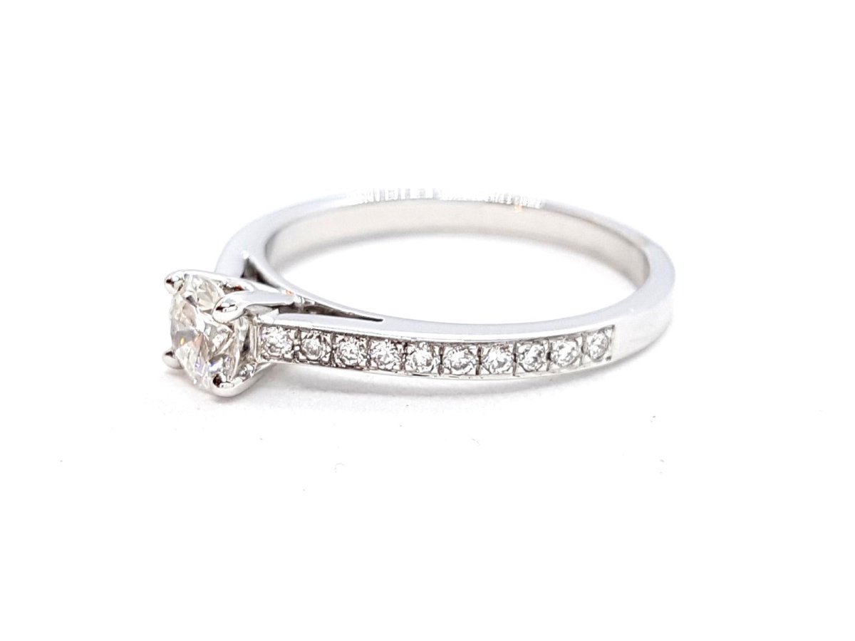 Solitaire en or blanc 750 millièmes (18 carats). serti de diamants taille brillant G- VS2 pour 0.61 carat au total. dont diamant central certifié GIA de 0.42 ct taille brillant G-VS2 et épaulé de 20 diamants taille brillant pour 0.19 ct au total. tour de doigt: 53. largeur sur le dessus: 0.48 cm. largeur de l'anneau: 0.20 cm. poids total: 2.67 g. poinçon tête d'aigle. état neuf