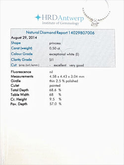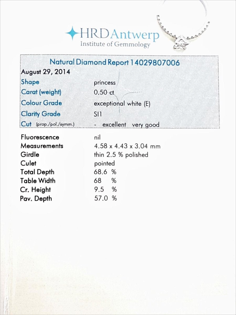 Solitaire en or blanc 750 millièmes (18 carats). serti d'un diamant central taille princesse E-SI1 de 0.50 ct certifié HRD. et épaulé de 16 diamants taille brillant pour 0.16 ct au total. tour de doigt: 53. largeur sur le dessus: 0.45 cm. largeur de l'anneau: 0.14 cm. poids total: 1.97 g. poinçon tête d'aigle. état neuf