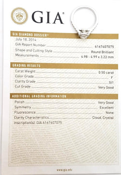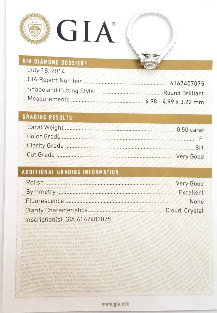 Solitaire en or blanc 750 millièmes (18 carats). serti de diamants pour 0.91 carats au total. dont diamant central taille brillant F-SI1 de 0.50 ct certifié GIA. entouré de 16 diamants taille brillant. et épaulés de 12 diamants taille brillant. deux diamants supplémentaires sur les cotés de la monture. tour de doigt: 53. diamètre du motif sur le dessus: 0.73 cm. hauteur: 0.58 cm. largeur de l'anneau: 0.18 cm. poids total: 3.10 g. poinçon tête d'aigle. état neuf