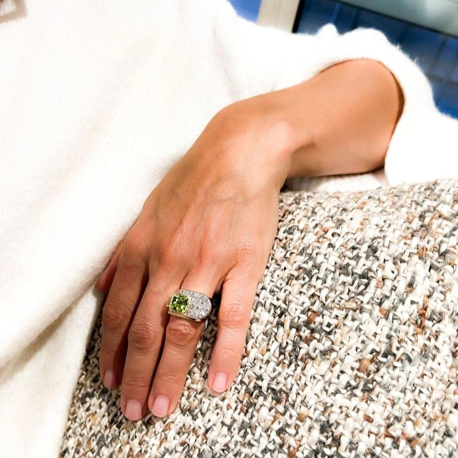 Bague Tank en or rose et platine rehaussée de diamants et péridots taille émeraude d'environ 6 carats. Longueur : 1,5 cm; Largeur : 2,5 cm. Nombre de pierres : 23 diamants taille ancienne. Circa : 1945-1950.