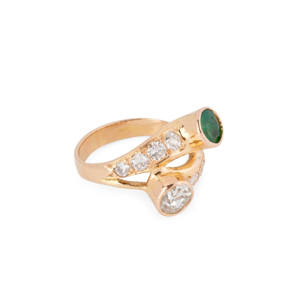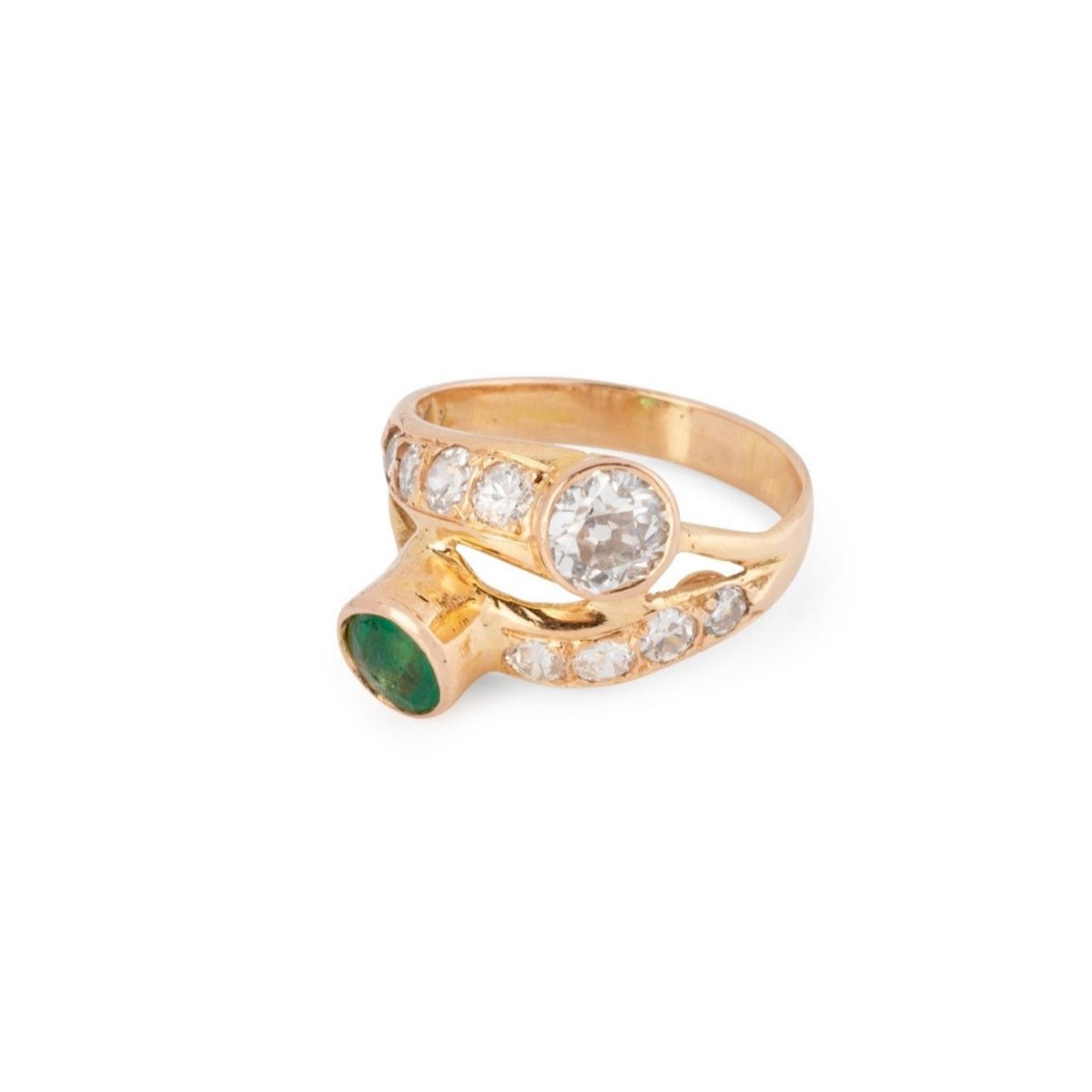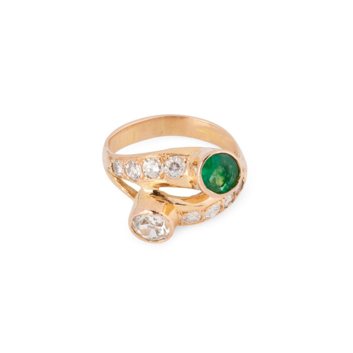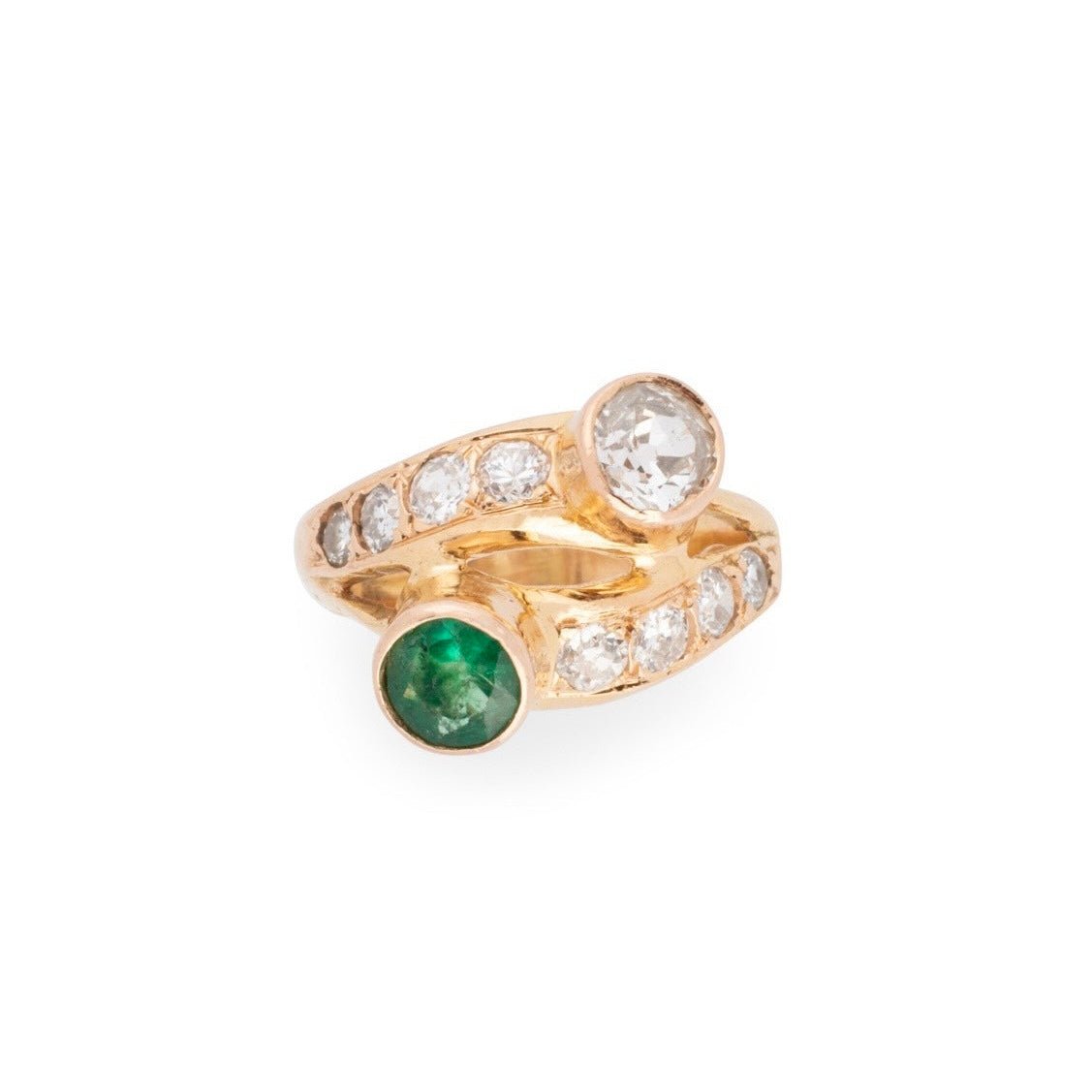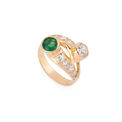 Bague Toi & Moi en or jaune 18 carats, ornée d'une émeraude en serti clos et d'un diamant taille ancienne. La monture est soulignée de diamants taille brillant.
