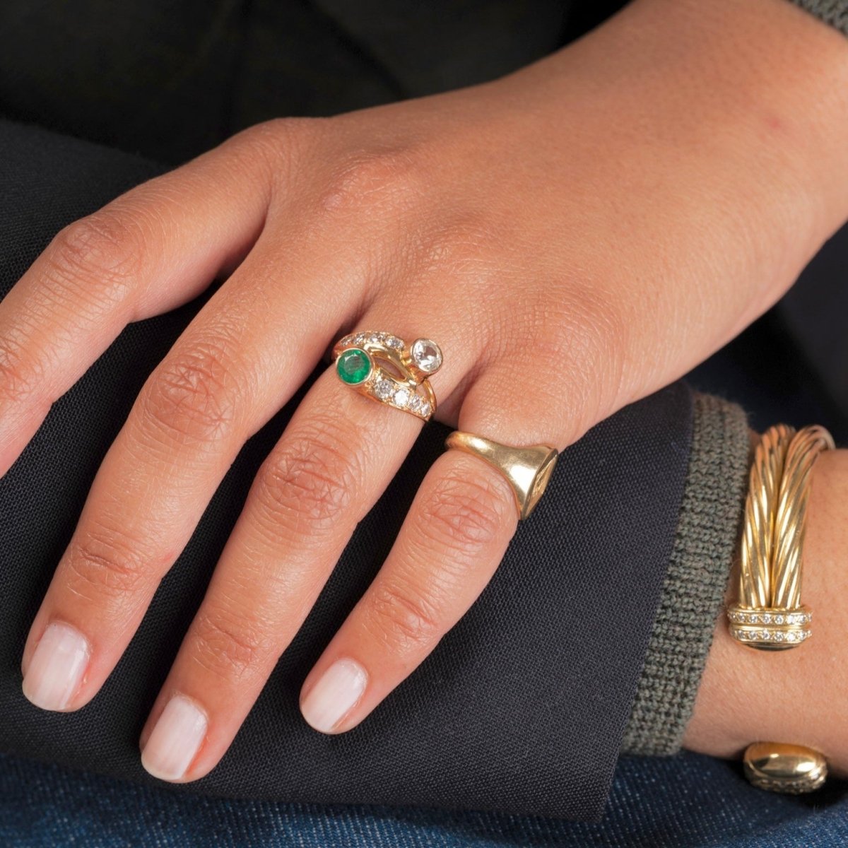 Bague Toi & Moi en or jaune, émeraude et diamants