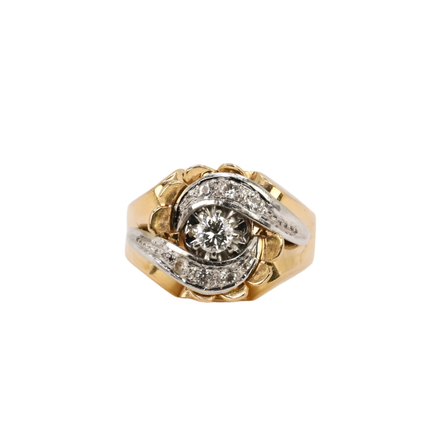 Bague de style Art Déco en or 18k (750°/°°) composée d’un motif tourbillon en or blanc serti de diamants taillés en rose et sertie en son centre d’un diamant pesant environ 0,25 carats qualité HI/ VS.Travail français de la fin des années 1940.Présence d’un poinçon de fabricant (.W. pour Wegelin SA) et d’un poinçon tête d’aigle. Bel état état général, Infimes rayures d’usagePoids : 5,97 grammesTaille de doigt : 58, mise à la taille possible