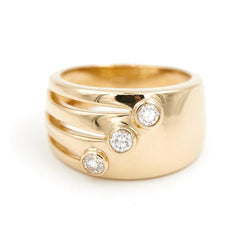 Bague trilogie en or jaune 750 millièmes (18 carats). sertie de 3 diamants taille brillant. d'environ 0.13 ct chacun. poids total diamant: environ 0.39 ct. largeur sur le dessus: 1.22 cm. taille de doigt: 54. poids total: 9.35 g. poinçon tête d'aigle. excellent état