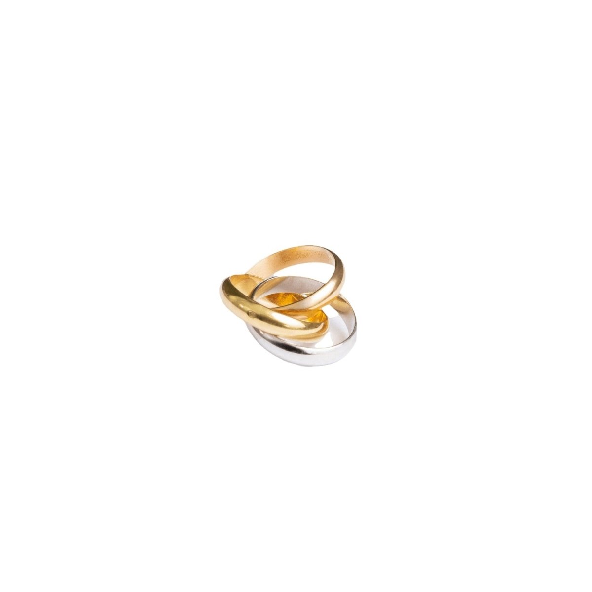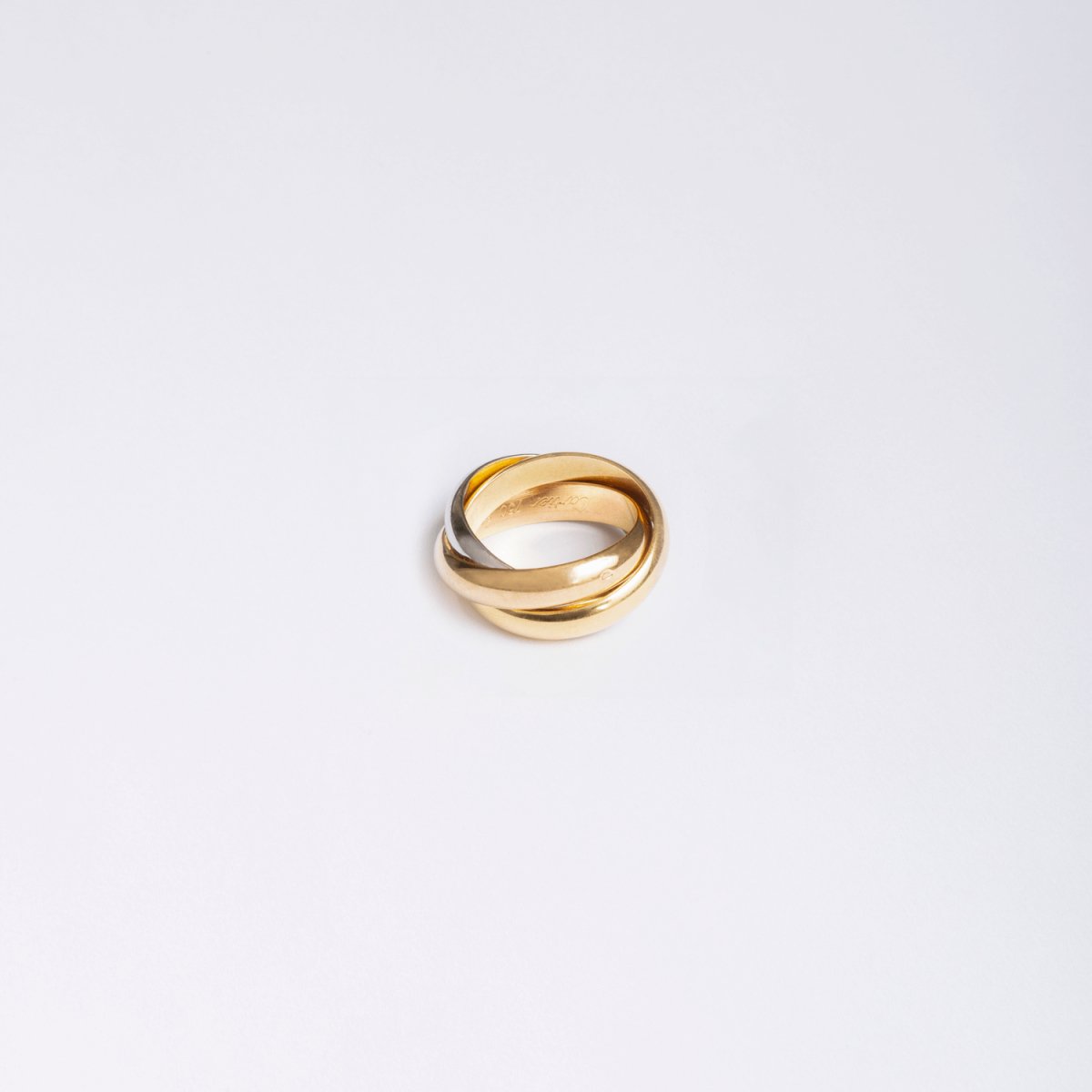 Bague modèle "Trinity" trois ors 18 carats, formée de trois anneaux entrelacés. Signée CARTIER. Poids : 12,10 g Tour de doigt : 55 La bague Trinity est une icône de la Maison Cartier. Créée en 1924 par Louis Cartier, la bague est un vrai symbole au graphisme design et inspiré de l'Art Déco. Réf. M952