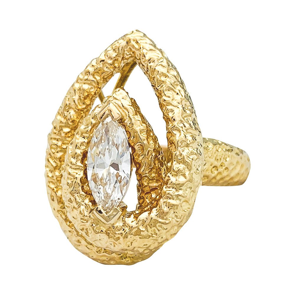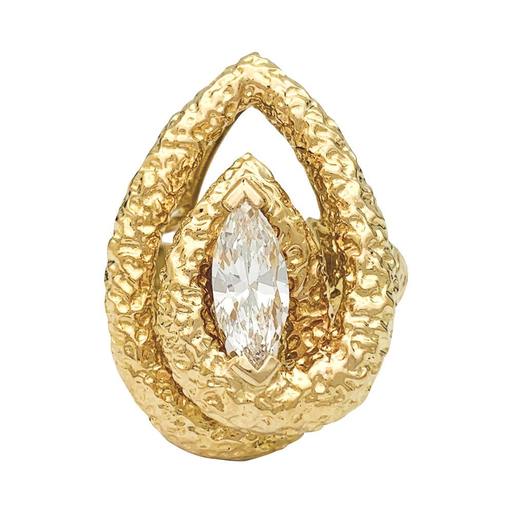 Une bague signée de la Maison Van Cleef et Arpels en or jaune 750/000 'mimosa' en forme de double amande sertie d'un diamant taille navette pesant 0,78 carat. Qualité du diamant H-VVS2. Longueur : 26 mm Largeur : 19 mm Poids : 11,4 grammes Tour de doigt : 53