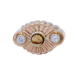 Une bague chevalière en or rose 750/000 et platine 950/000, de forme ovale à décor de godrons, ornée d'un cabochon de citrine et de deux diamants taille ancienne. Poids : 12,6 grammes Tour de doigt : 56