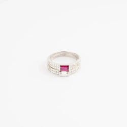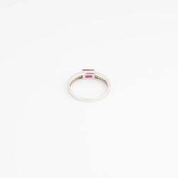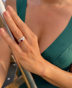 2 Bagues de la maison Van Cleef and Arpels ornées pour l'une d'un diamant taille émeraude et l'autre d'un rubis taille émeraude d'environ 0,10ct chacun sur une double descente de diamants de chaque côté. Matière : Or gris 18kPoinçon :Tête d'aigle Poids : 4,6grsLargeur : 0,5 cmTour de doigt Modifiable : 54Nombre carat: les pierres centrales 0,10 x2 et pavage total 0,50 ctsNombre de pierres: 50 pierresPériode: 1990