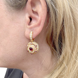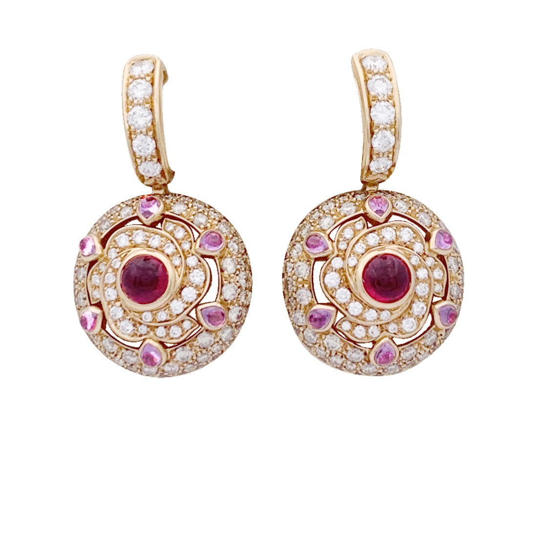 Boucles d'oreille Boucheron, "Jeanne", or rose, diamants, saphirs roses et rubis.