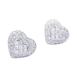 Une paire de boucles d'oreille figurant un coeur en or blanc 750/000 serti de diamants. Le centre du coeur est serti de 12 diamants taille princesse et le tour d'un pavage de diamants taille brillant. Qualité estimée des diamants : H/SI. Longueur : 12 mm Largeur : 13 mm Poids brut : 6,4 grammes Poids (diamant) : 2 carats environ