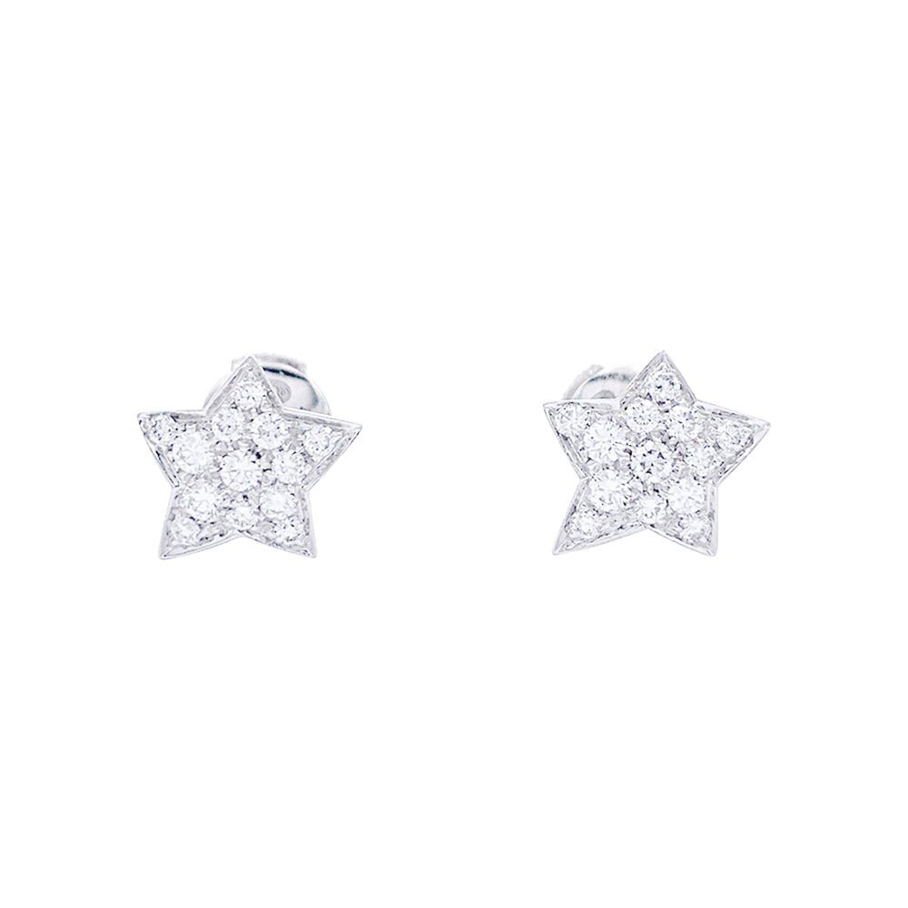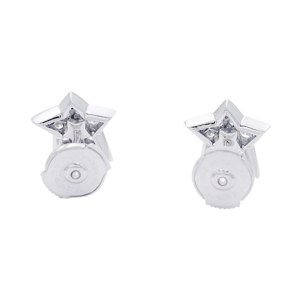 Une paire de boucles d’oreilles Puces signée de la Maison CHANEL, collection “Comète”, en or blanc 18 carats figurant des étoiles sertie de diamants taille brillant. Fermoir Alpa. Poids : 3,3 g Poids du diamant : 0,60 carat environ Longueur : 11 mm Largeur : 11 mm