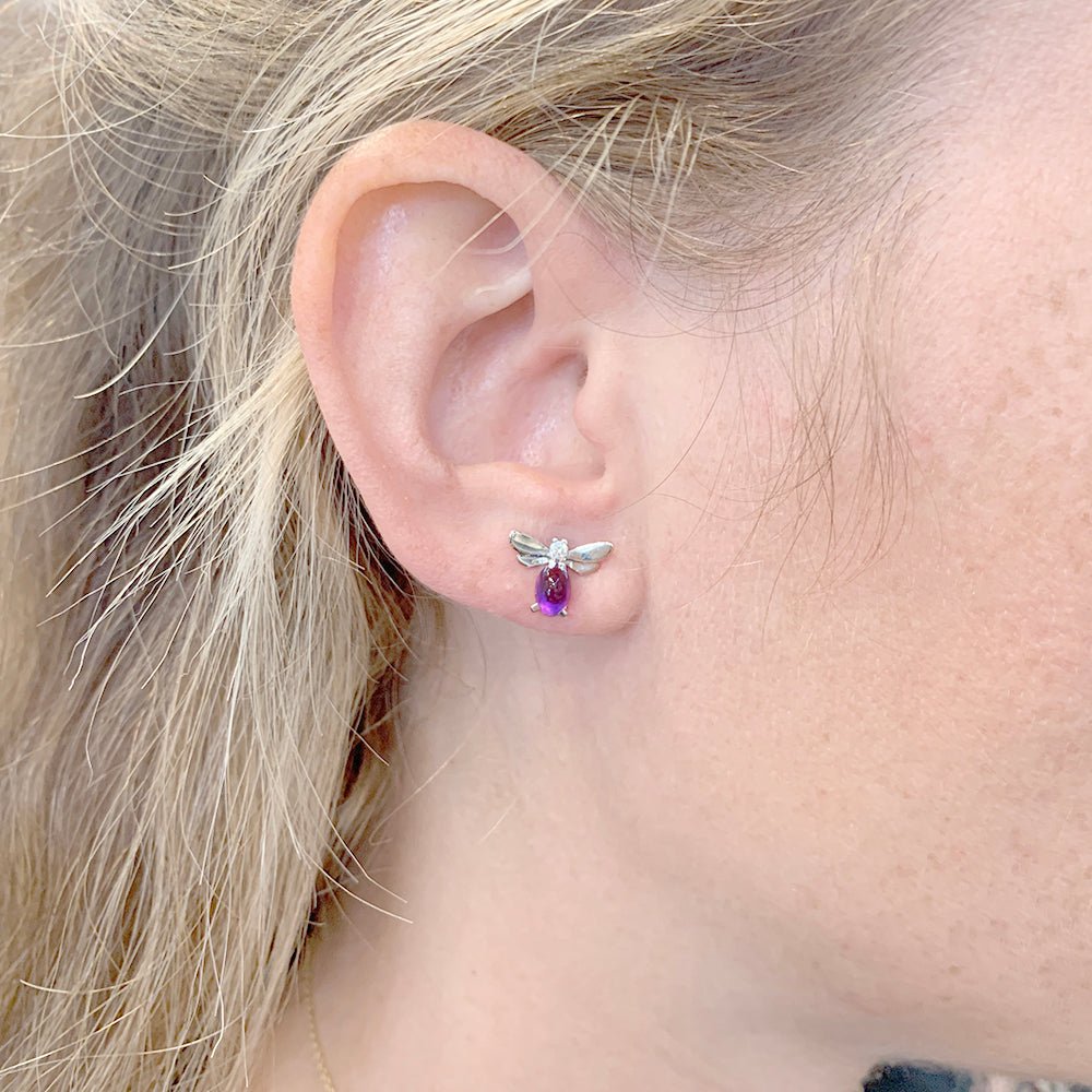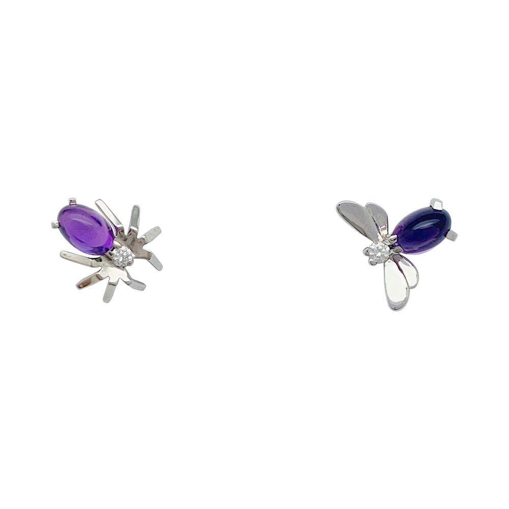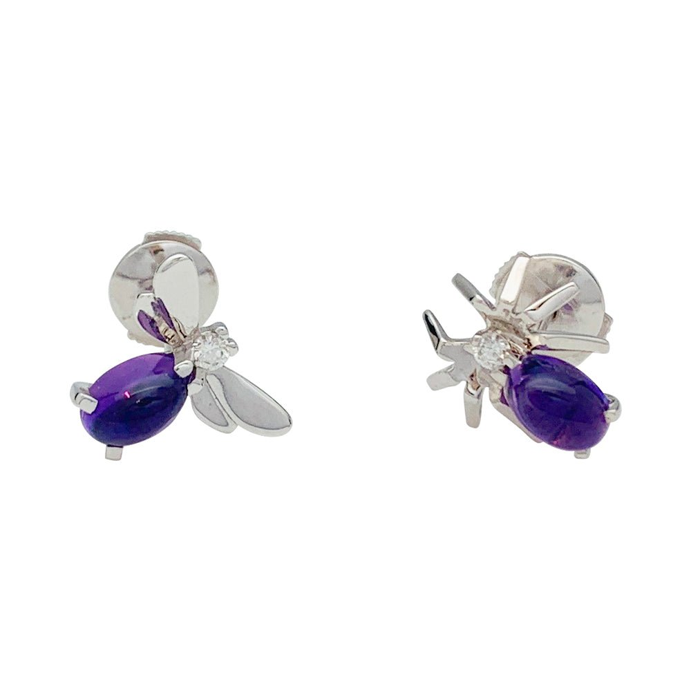 Une paire de puces d'oreilles signée de la Maison Chaumet, collection 'Attrape-moi...si tu m'aimes', en or blanc 750/000 figurant une araignée et une abeille. Chacune sont sertie d'un diamant taille brillant de 0,03 ct et d'un cabochon d'améthyste de 0,65 ct. Poids : 2,2 grammes