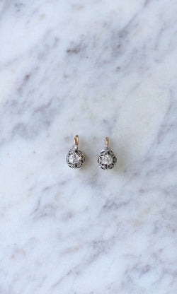 Boucles d'oreilles dormeuses en or rose 18kt et platine (poinçon : tête de cheval) ornées de deux diamants taillés à l'ancienne dont le poids total est estimé à environ 0,55 Ct (couleur estimée H et J/ Pureté estimée VS), surplombés de deux petits diamants taillés en rose. Chaton ouvragé en platine, système de fermeture en or rose 18kt. Monture numérotée. Travail Français de la fin du XIXe Siècle. Poids brut: 3,50 g Hauteur totale: 1,40 cm Largeur: 0,80 cm État: très légères micro rayures sur les parties or et platine, une petite ébréchure sur un des deux gros diamants, voir photos.
