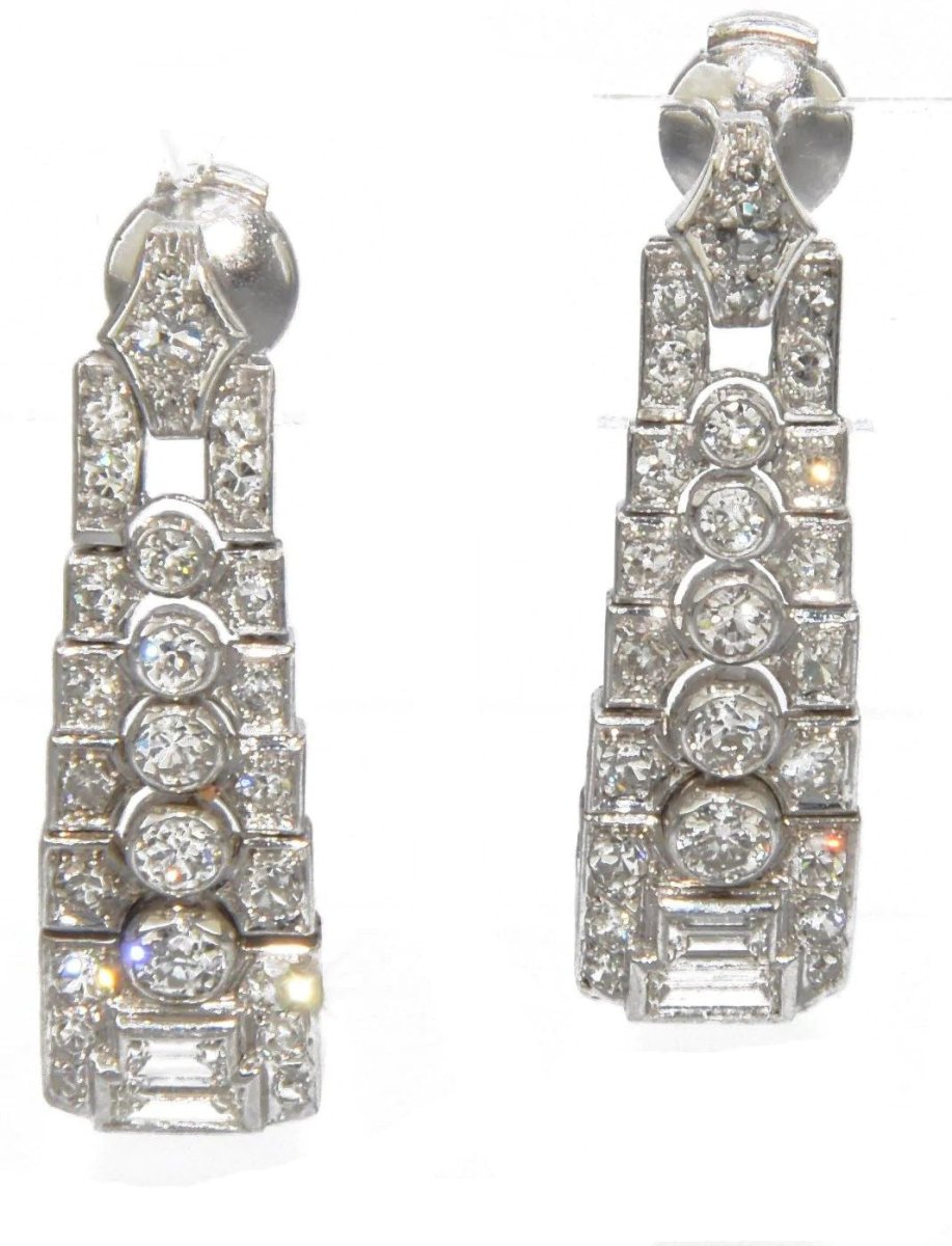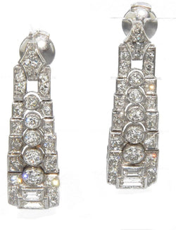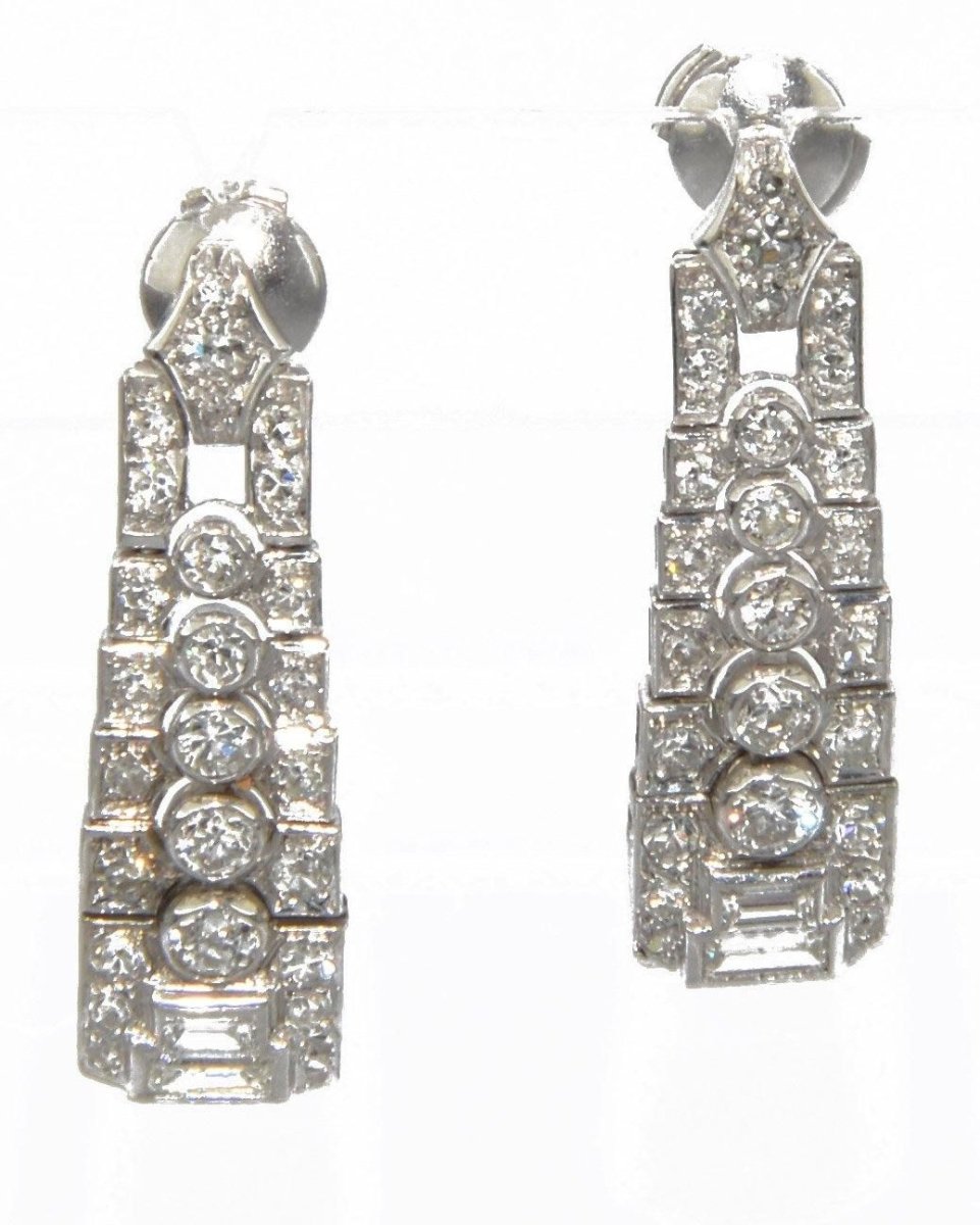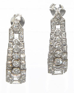 Longue paire de boucles d'oreilles datant des années 1930 entièrement pavée de diamants baguettes et diamants ronds. Pour oreilles percées modifiable Matière : Platine Poinçon : Tête de chien Poids : 11,2grs Longueur :3,3cm Largeur : 1cm Nombre de pierres:52 Total Carat: 1,80cts Période:1930