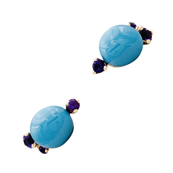 Une paire de boucles d’oreille signée de la Maison Pomellato, modèle “Capri” en or rose 750/000, serties d'une céramique turquoise entourée de 3 améthystes. Longueur : 150 mm Largeur : 70 mm Hauteur : 160 mm Poid : 8,7 grammes Prix neuf : 1900