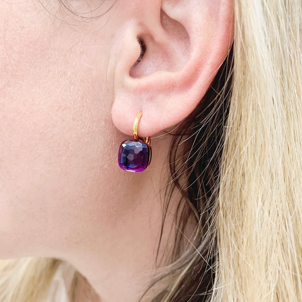 Une paire de boucles d’oreilles signée de la Maison Pomellato, collection 'Nudo Classic', en or rose et blanc 750/000 ornée d’améthystes facettées. Longueur : 20 mm Largeur : 10 mm Hauteur : 10 mm Poid : 9,3 grammes Prix neuf : 4850 Boite d'origine : Oui