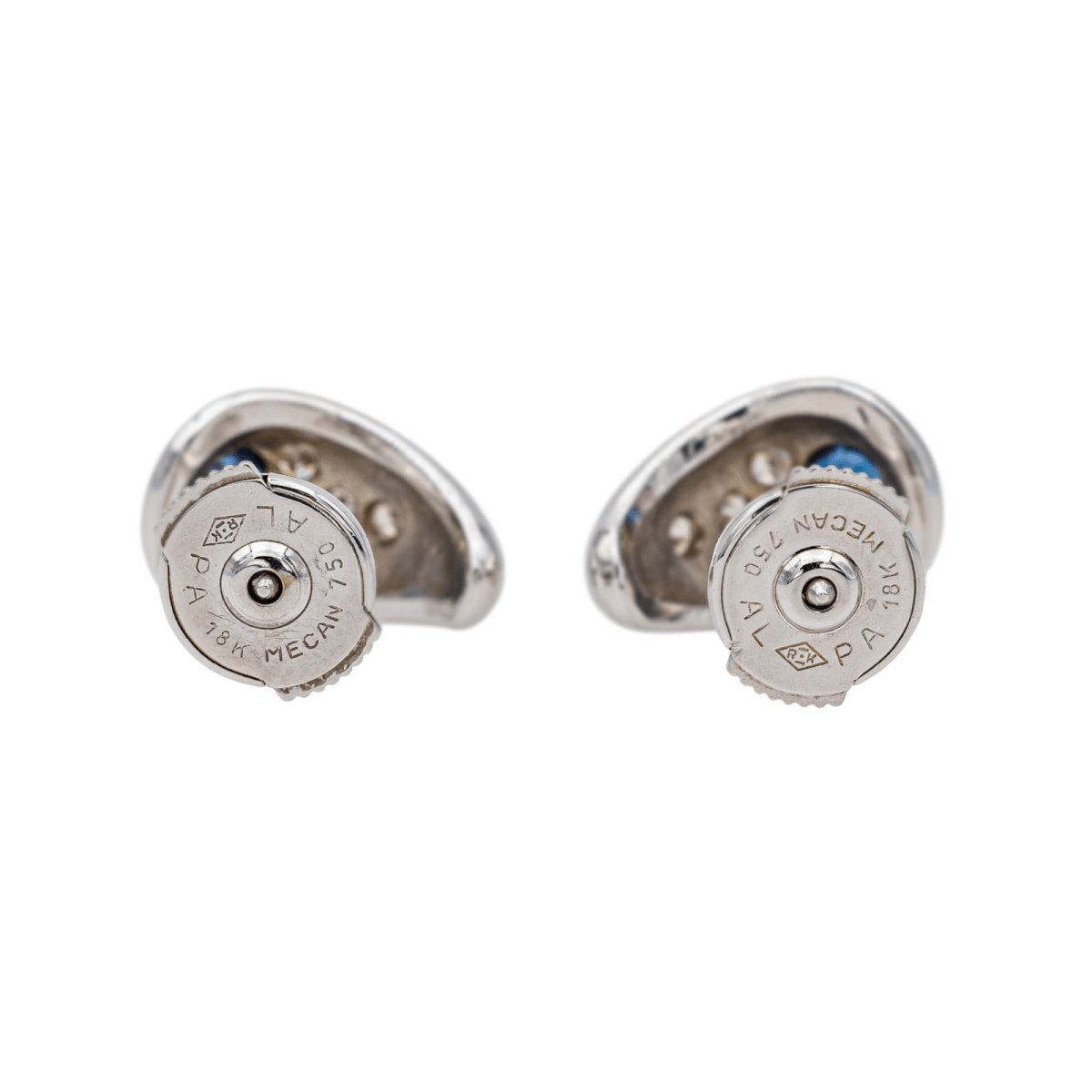 Boucles d’oreilles puces en or blanc 750 millièmes (18 carats). serties de saphirs et de diamants. 2 saphirs taille rond. d'un poids total d'environ 0.40 ct. (chaque saphir d'un poids d'environ 0.20 ct). et 8 diamants taille brillant. d'un poids total d'environ 0.16 ct. (chaque diamant d'un poids d'environ 0.02 ct). dimensions : 1.30 cm x 0.81 cm. poids total : 5.16 g. poinçon tête d’aigle. excellent état