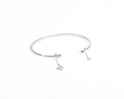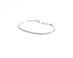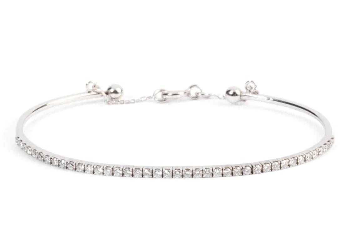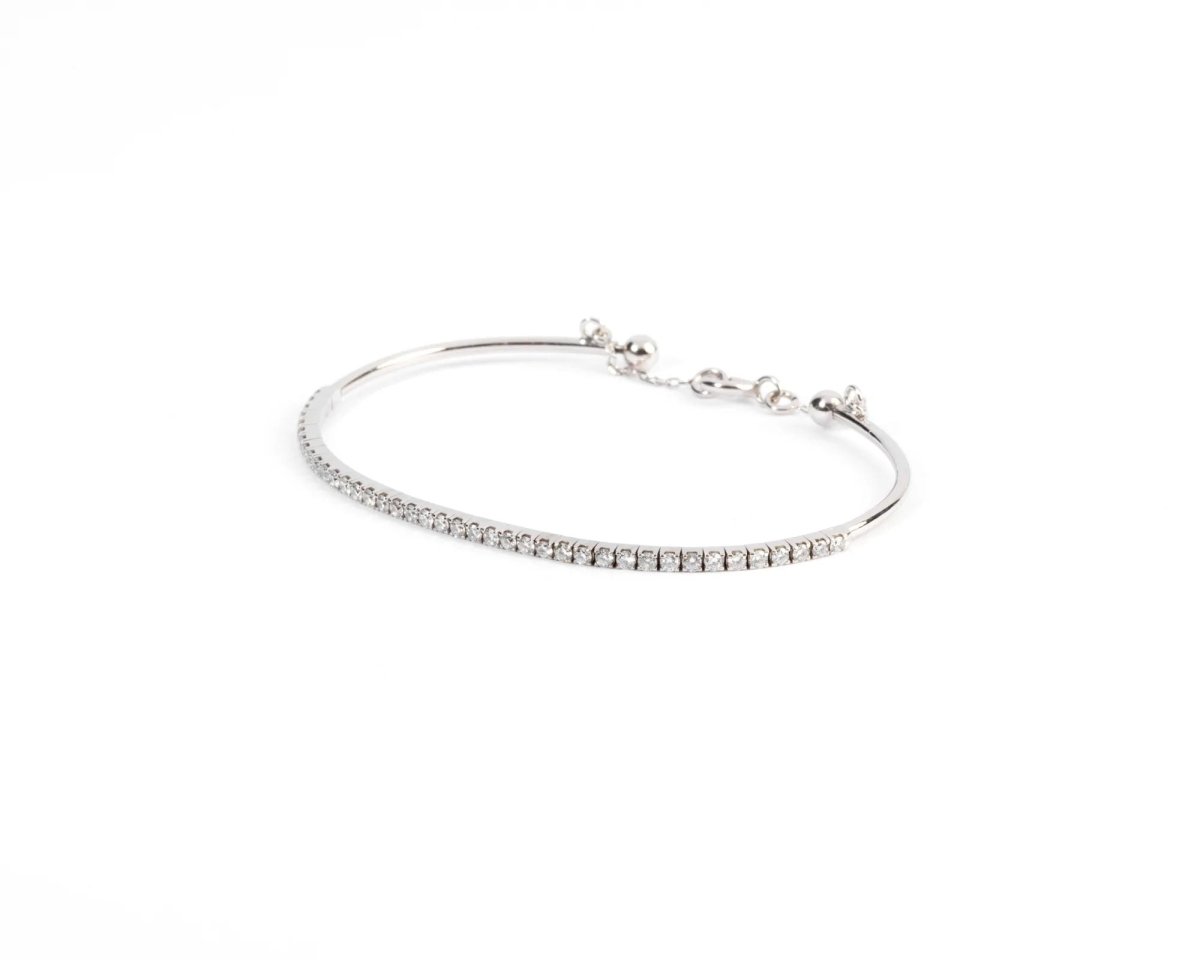 Bracelet demi jonc or gris et diamant sur le dessus avec chainette de sécurité. Matière : Or gris 18k Poinçon : Tête d'aigle Poids : 4,5 grs Diamètre : 6 cm Nombre de pierres: 40 Nombre carat: 0,90 ct Période: 2000