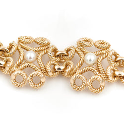 Bracelet en or jaune 750 millièmes (18 carats). Fil torsadé représentant des fleurs sertie de 8 perles de culture (environ 5 mm de diamètre). Tour de poignet : 19 cm. Largeur des motifs: 2.5 cm. fermoir avec huit de sécurité. Poids total: 43.12 g. Poinçon hibou. Excellent état