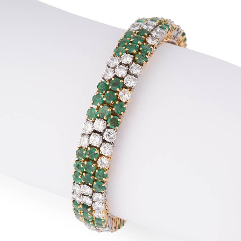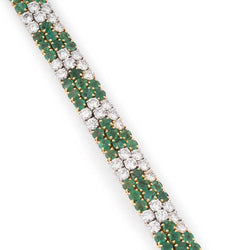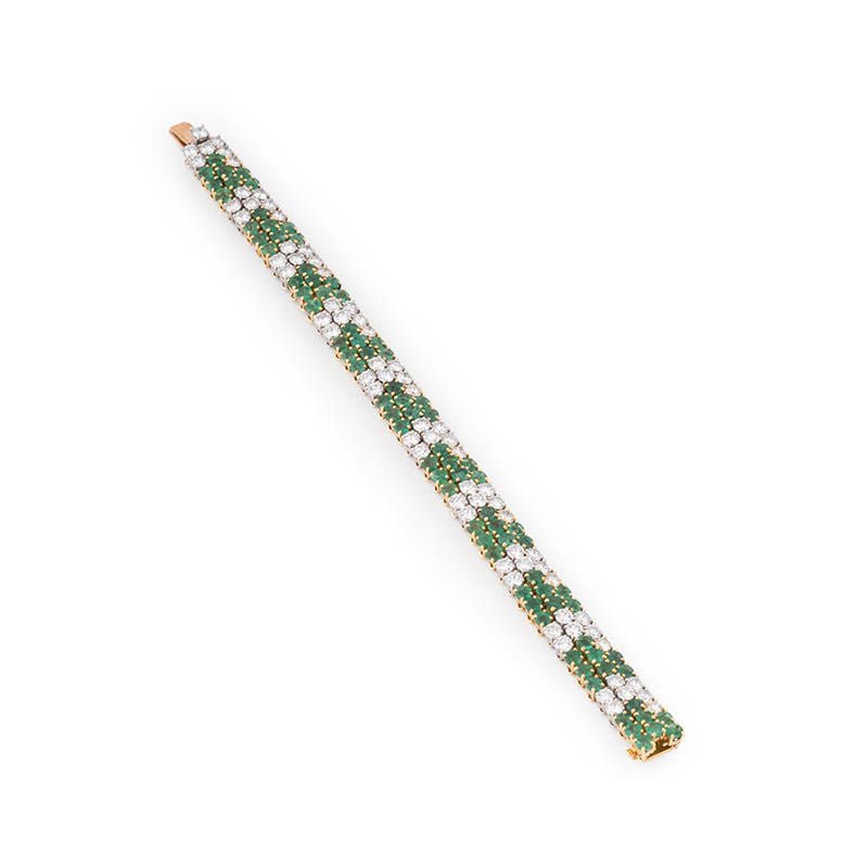 Bracelet Ligne 3 rangs en or jaune 18 carats et platine, serti de diamants taille moderne "extra blanc" et d'émeraudes. Circa 1980.