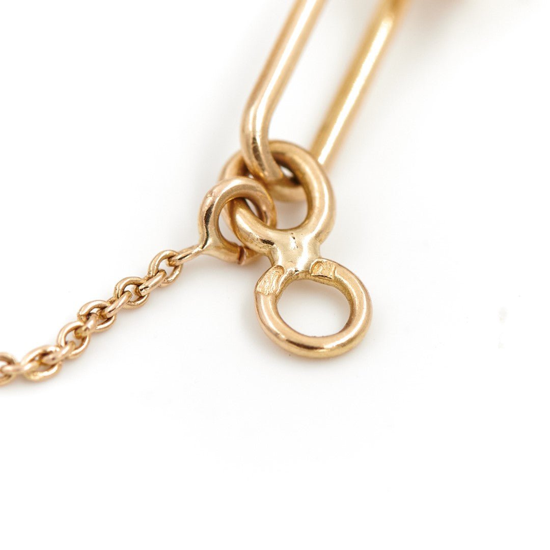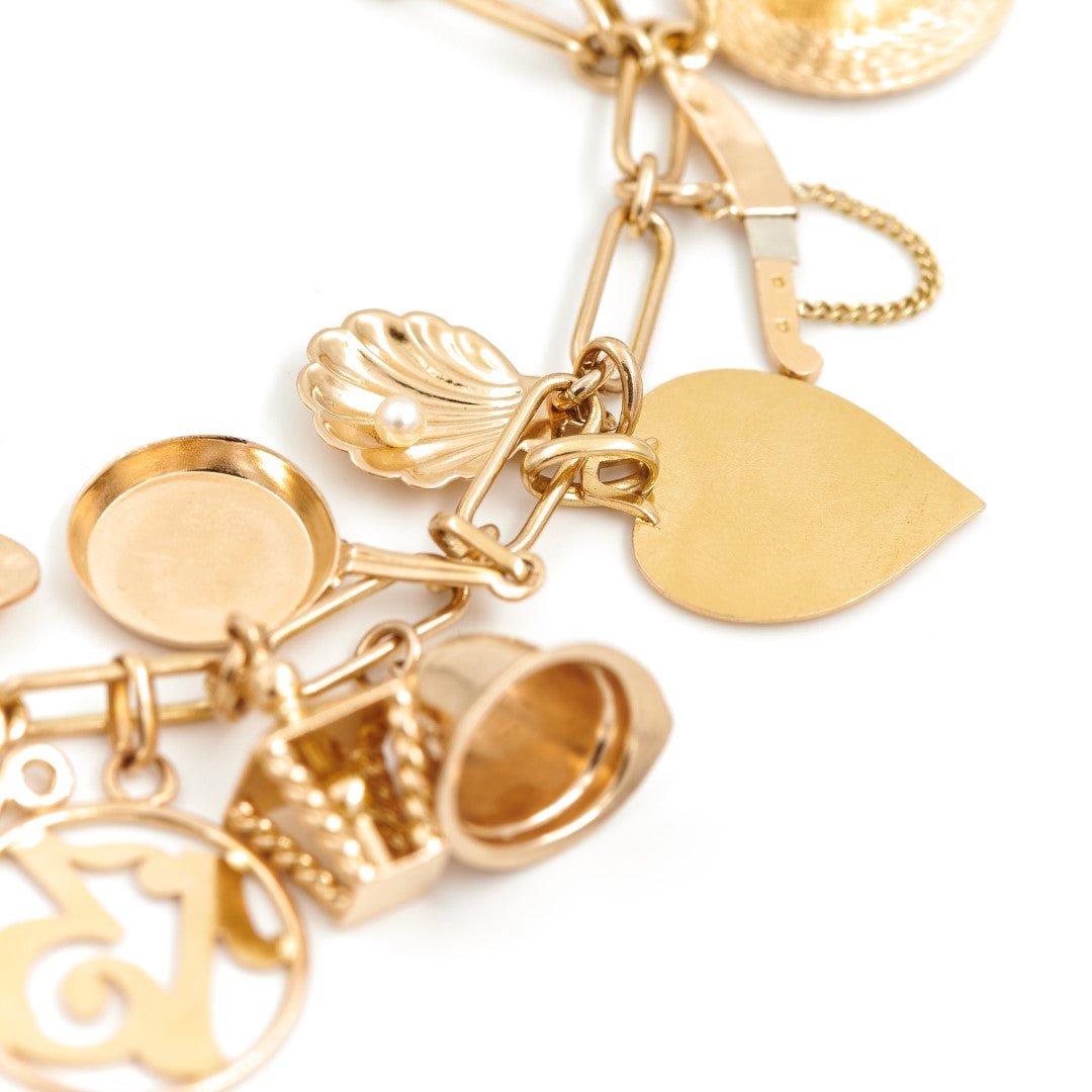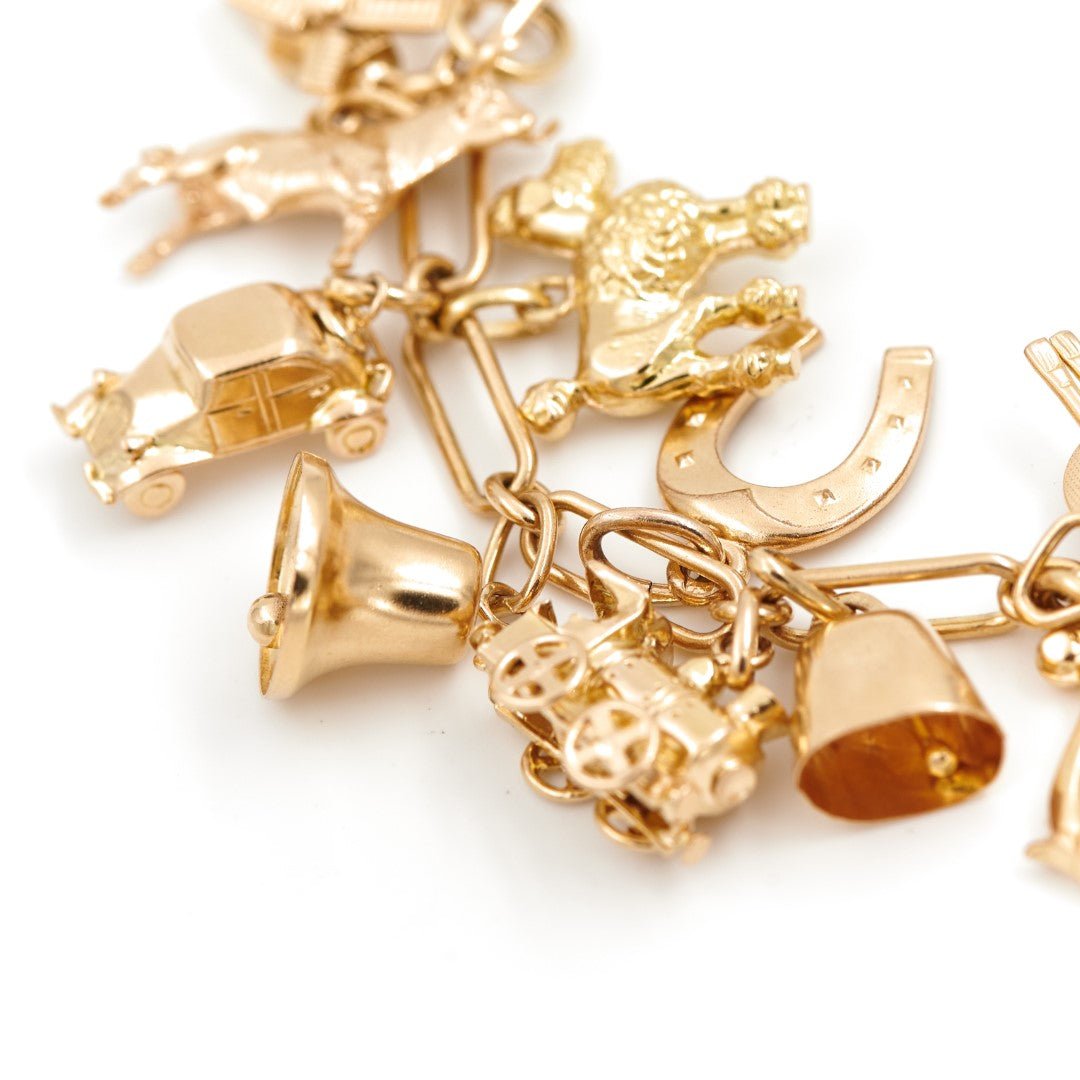 Bracelet en or jaune 750 millièmes (18 carats). maille ovale. 22 breloques diverses. roulette russe de 1.35 cm x 1.35 cm. pampille : 2.37 cm x 0.86 cm. moulin : 1.02 cm x 0.47 cm. taureau : 1.84 cm x 0.99 cm. voiture : 1.45 cm x 0.68 cm. caniche : 1.16 cm x 1.50 cm. cloche : 0.84 cm x 0.93 cm. fer à cheval : 1.31 cm x 1.12 cm. locomotive : 1.52 cm x 0.86 cm. cloche plate : 0.80 cm x 0.87 cm. palette de peinture : 1.19 cm x 0.95 cm. lyre : 1.77 cm x 1.32 cm. ciseaux : 2.03 cm x 0.33 cm. rond 13 : 1.75 cm x 1.75 cm. lanterne : 1.33 cm x 0.91 cm. casque de pompiers : 1.45 cm x 1.07 cm. coquillage avec perle de culture : 1.27 cm x 1.11 cm. coeur toi et moi : 2.01 cm x 1.58 cm. couteau : 2.03 cm x 0.33 cm. chapeau : 2.18 cm x 1.67 cm. trompe de chasse : 1.86 cm x 1.35cm. chainette de sureté. tour de poignet : 20 cm. poids total: 37.73 g. poinçon tête d'aigle. excellent état
