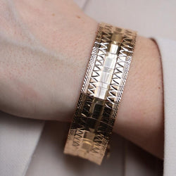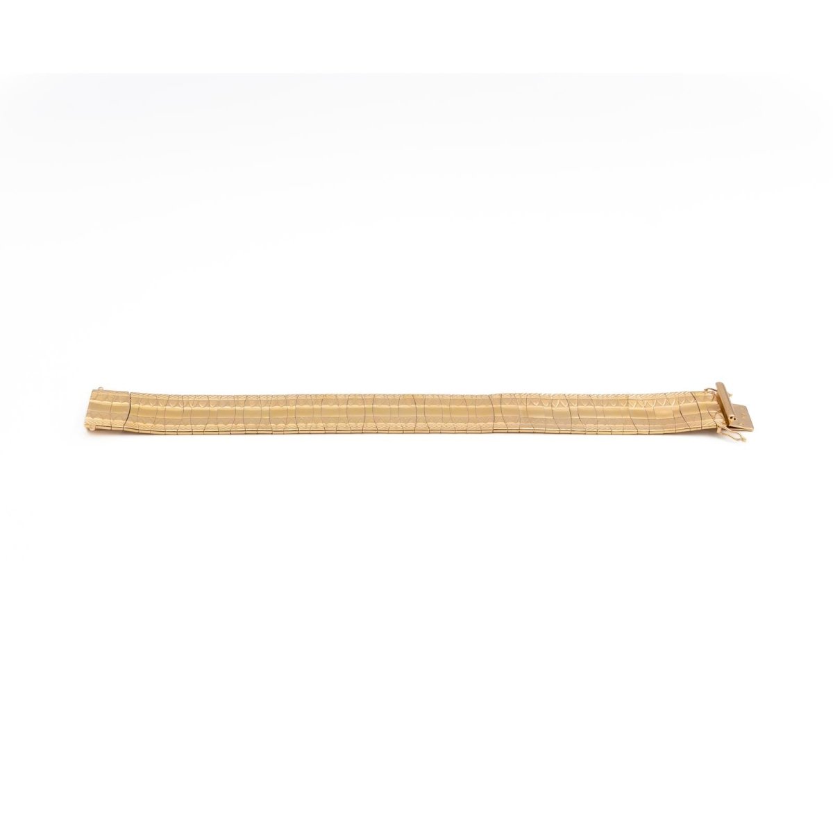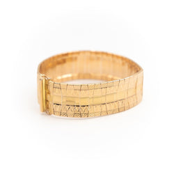 Bracelet manchette en or jaune 750 millièmes (18 carats). en or texturé. Tour de poignet: 20 cm. Largeur: 2.02 cm. Poids total: 39.36 g. Poinçon hibou. Excellent état