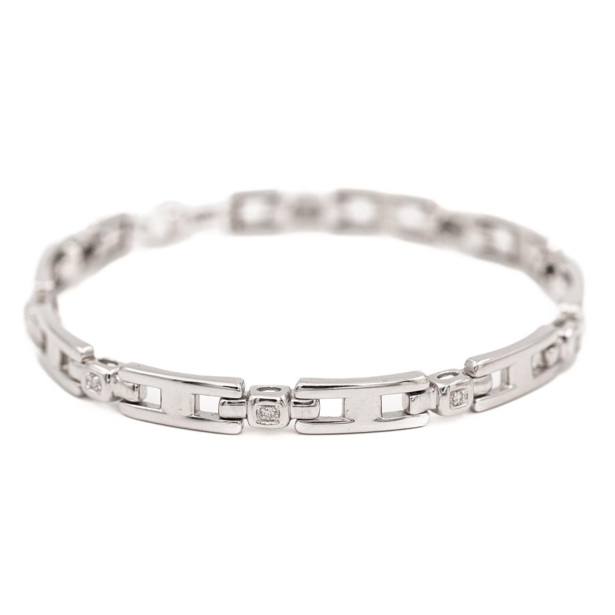 Bracelet or blanc 750 millièmes (18 carats). serti de 9 diamants taille brillant. poids total des diamants: environ 0.09 ct. maille en forme de H. longueur: 18 cm. largeur: 0.56 cm. poids total: 15.62 g. fermoir mousqueton. poinçon tête d’aigle. excellent état