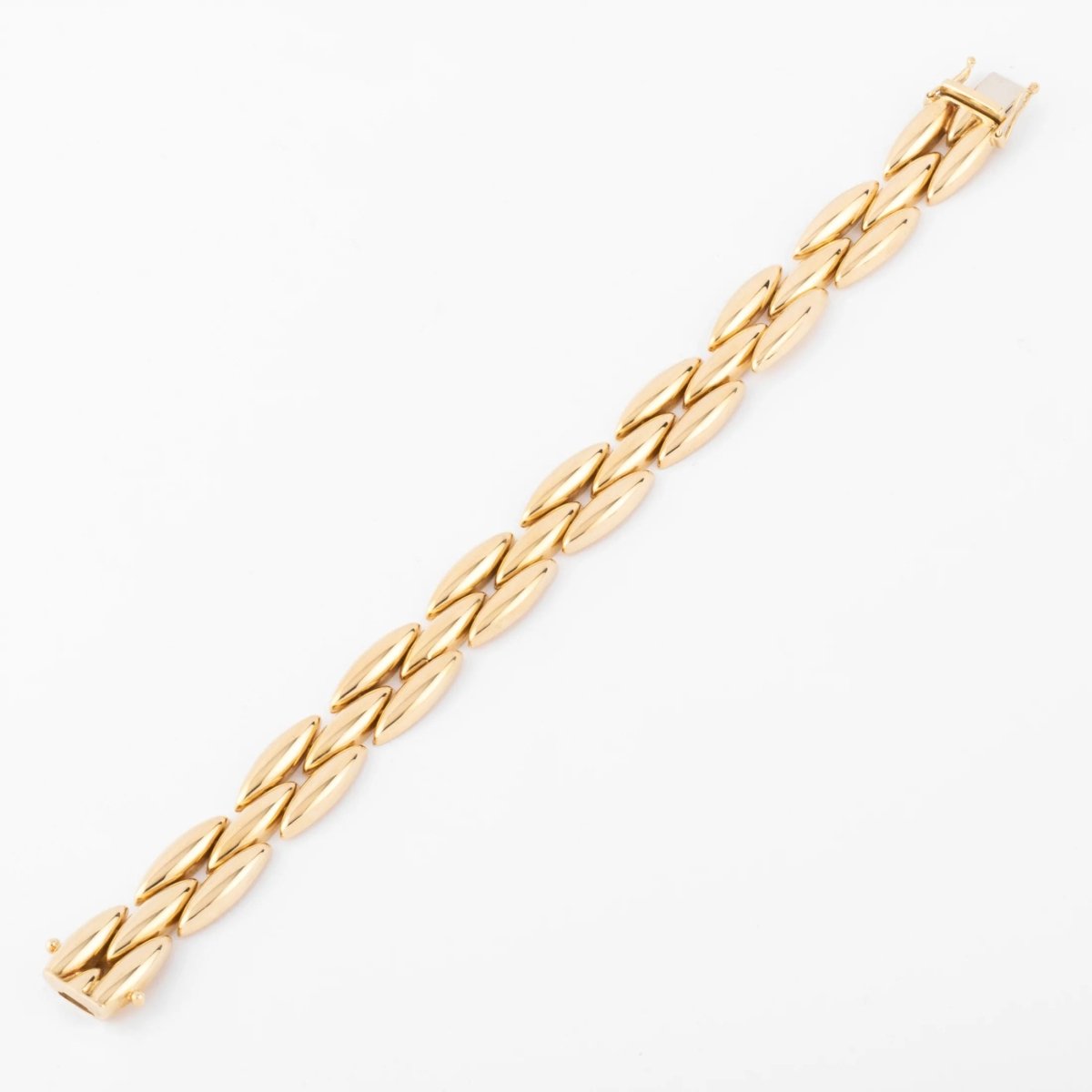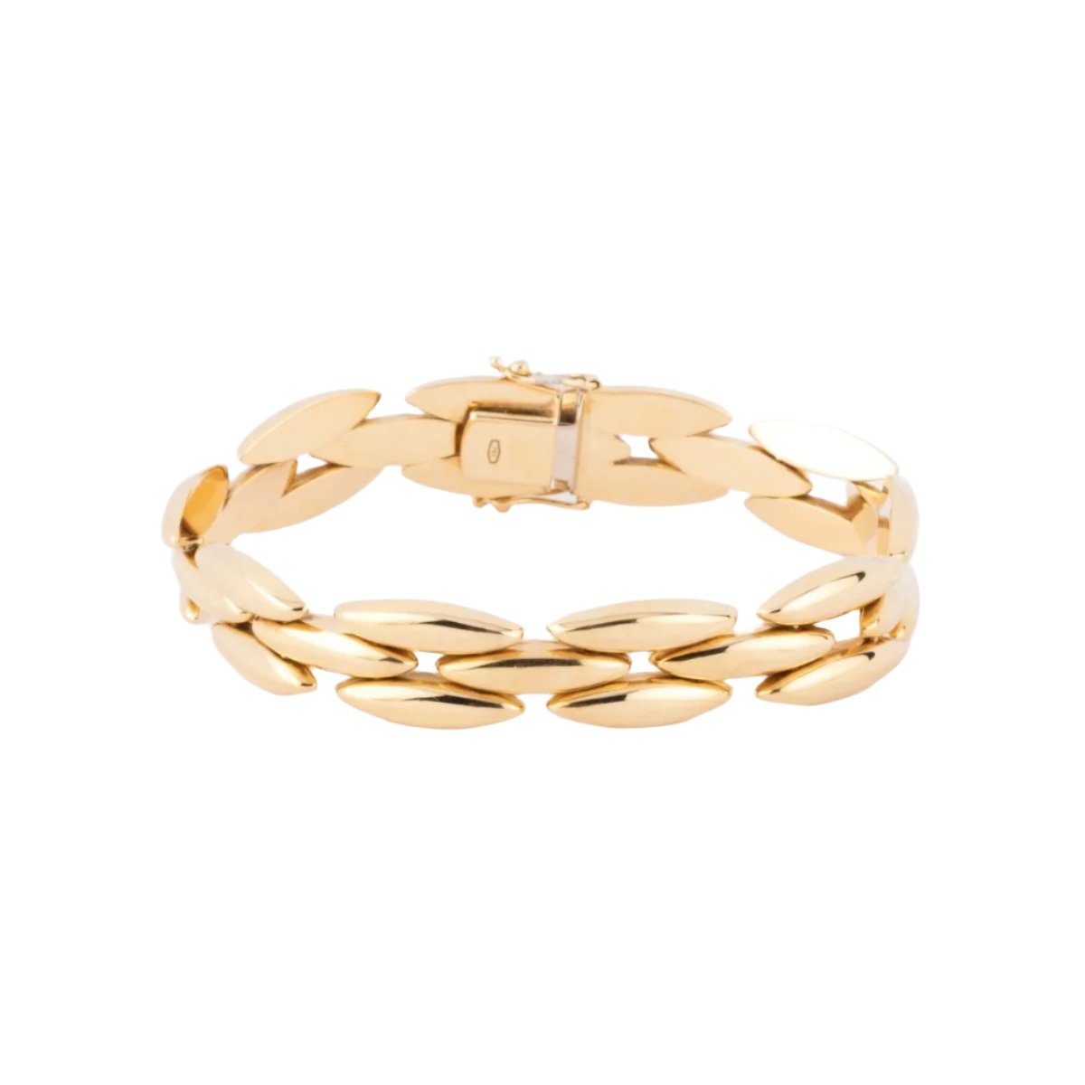 Bracelet or jaune de la maison Cartier modèle Gentiane composé d'une succession de maillons navettes articulés. Matière : Or 18k Poinçon : Signature et numéro 749190 Poids : 28 grs Longueur : 18,5cm Largeur : 1 cm Période: 1990