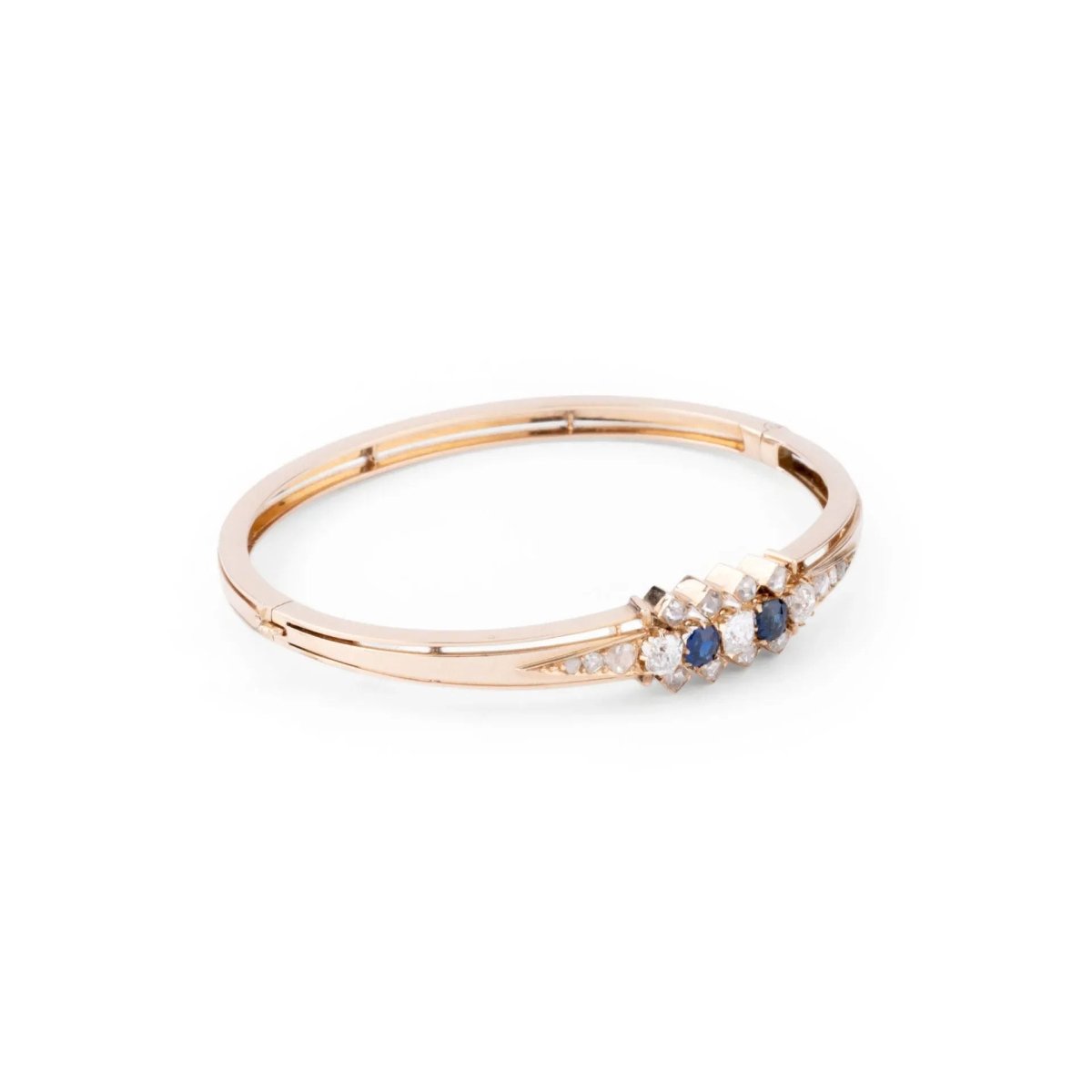 Bracelet or rose ouvrant sur le côté pavée sur le dessus de 2 motifs orné en diamants saphirs et diamants taille ronde Napoleon III . Matière : Or rose 18k Poinçon : Tête d'aigle Poids : 16,5grs Diamètre : 6,4cm Largeur : 6,4 cm Nombre de carat: 1,10 cts au total Période: Napoléon III